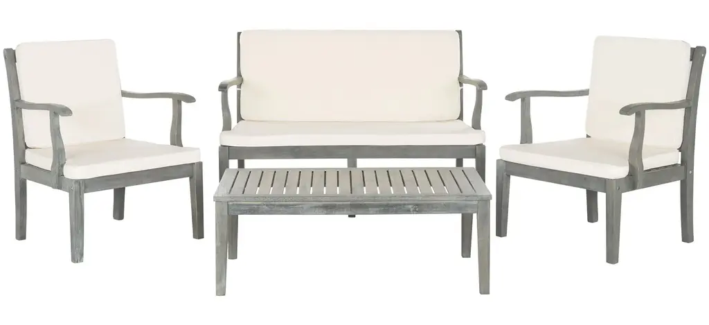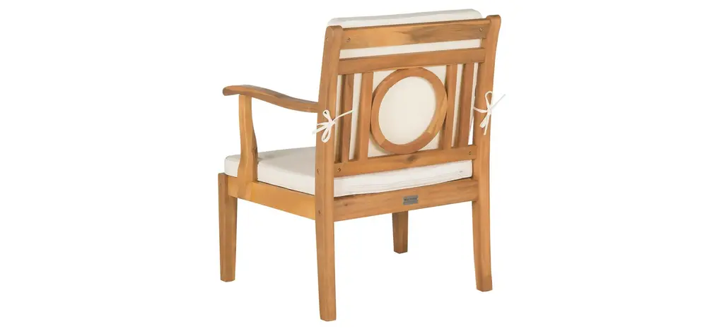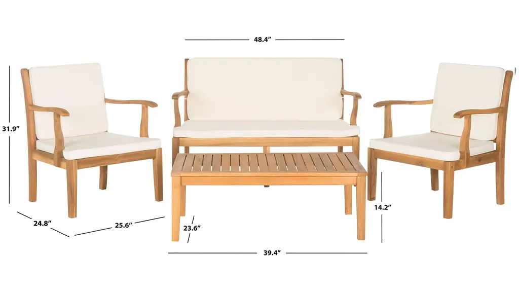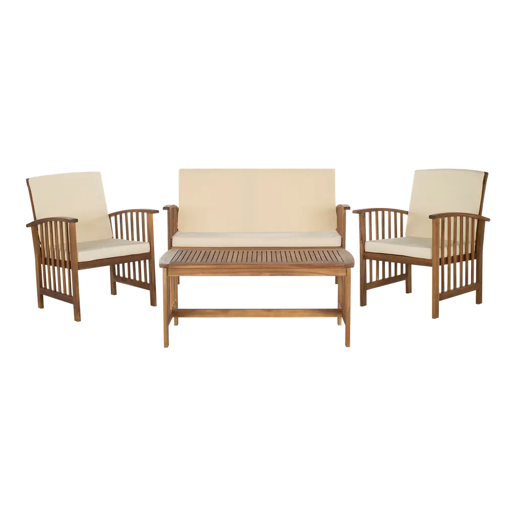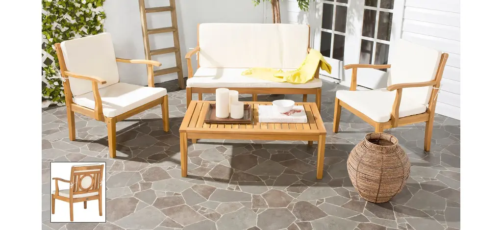 A contemporary update of classic British garden furniture, circle insets distinguish the slatted seat backs of the Pamella 4-pc. Patio Set. Crafted of sustainable acacia wood in a natural finish, the set features all weather cushions.