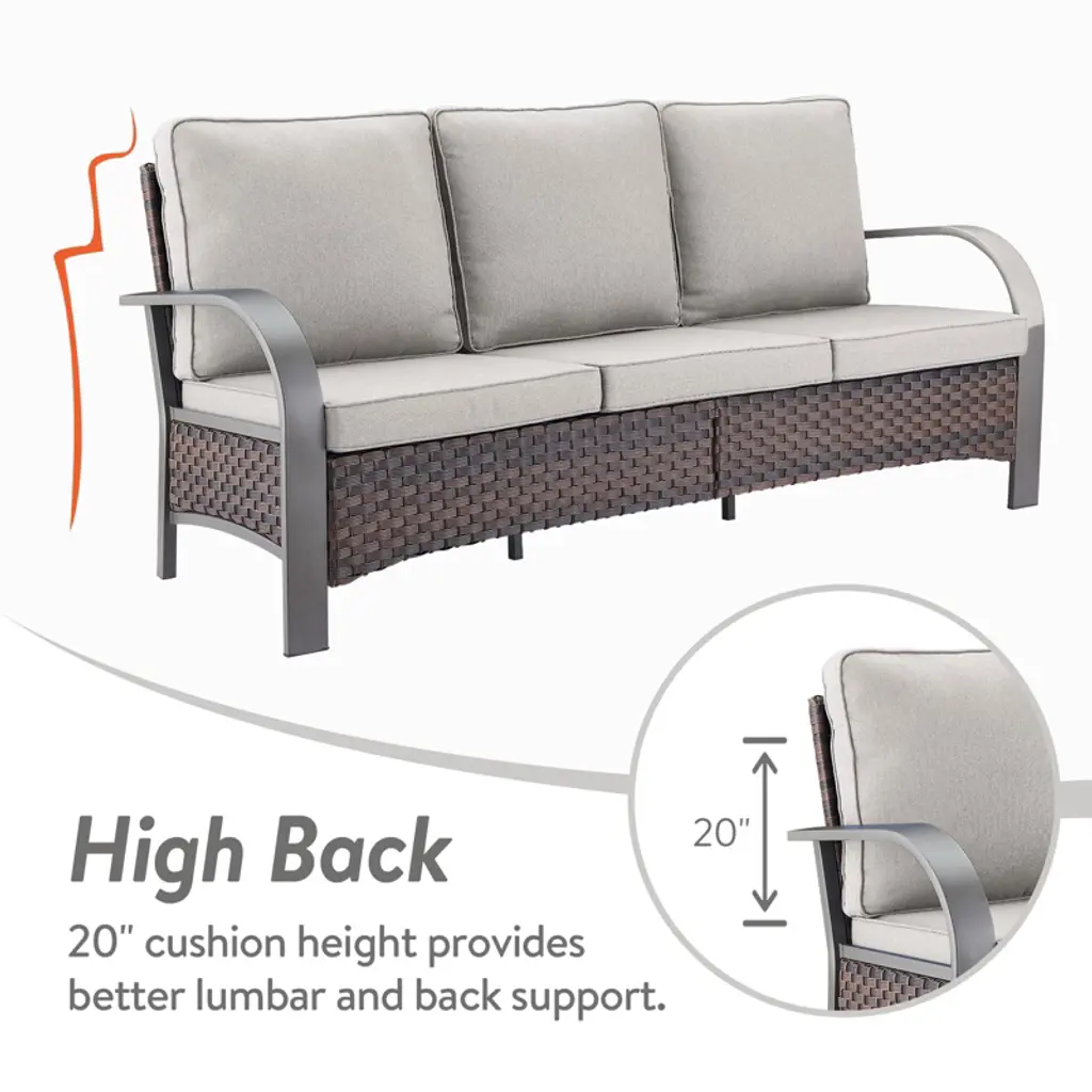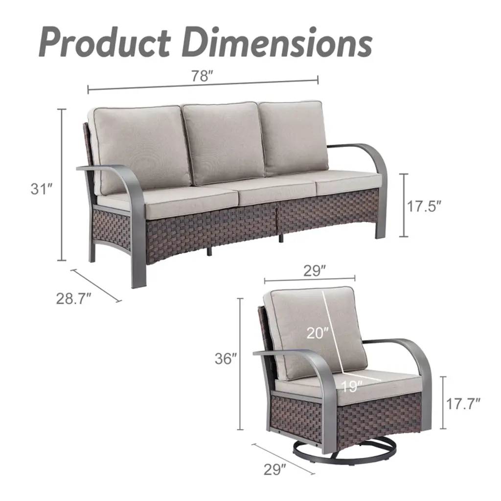 Elevate your outdoor living with the stylish POCASSY patio furniture set. This elegant conversation set includes a spacious three-seat sofa and two smooth swivel rocker chairs, offering both comfort and flexibility. Crafted with durable powder-coated steel frames and handwoven natural-look wicker, the set is built to last through the seasons. Combining timeless design with practical functionality, it!-s the perfect choice for relaxing evenings or lively outdoor gatherings.