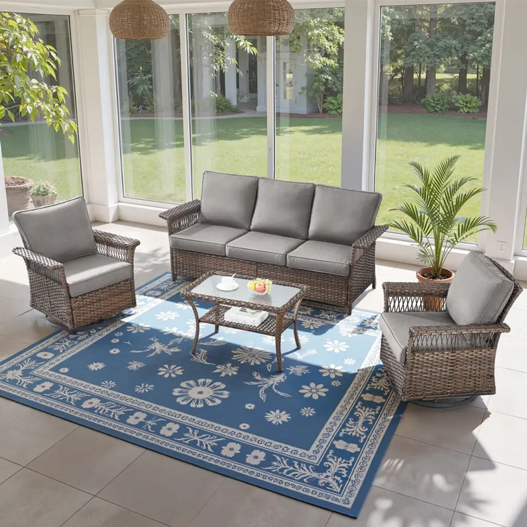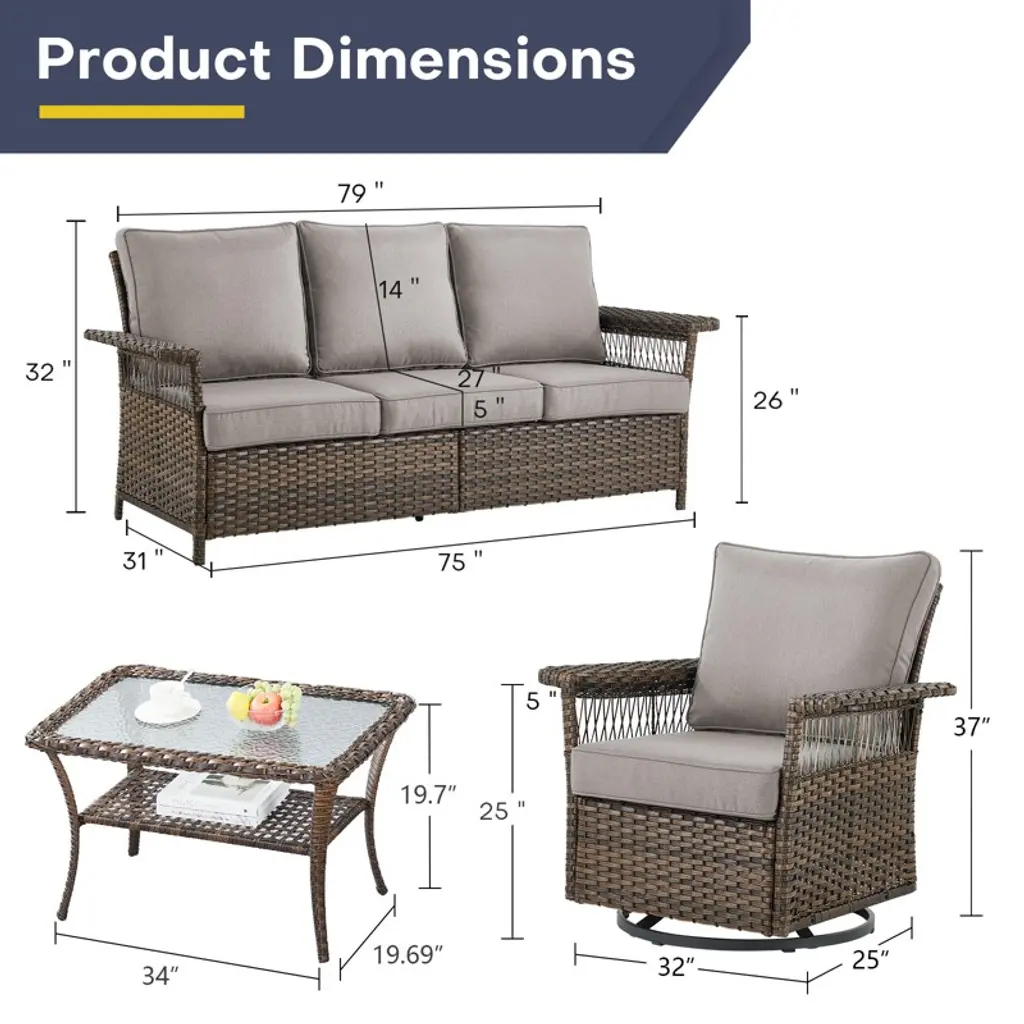The POCASSY luxury outdoor furniture set transforms your patio into the perfect relaxation space, featuring two smooth-gliding swivel rocking chairs, a generously proportioned couch, and a spacious coffee table designed for comfortable social gatherings. Carefully packed into three separate boxes for safe delivery, this patio set arrives in parts with an easy-to-follow assembly guide and instructional video that saves you over an hour of setup time - and should any piece be missing or damaged during transit, we'll promptly send replacements to ensure your complete satisfaction.