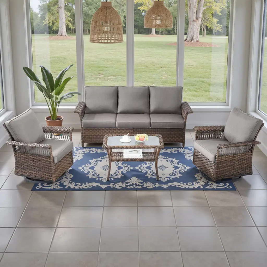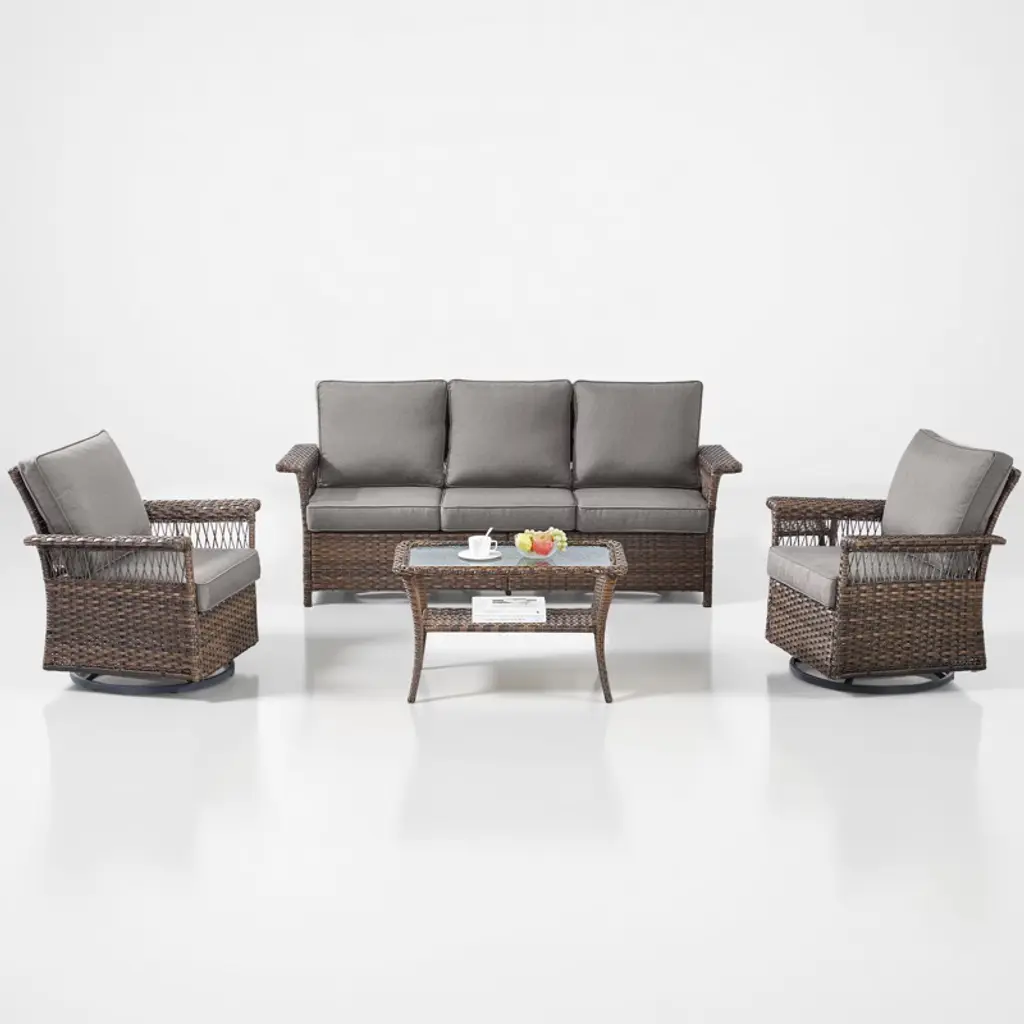 Pocassy 4 Pieces Patio Furniture Set, Patio Couch Set With Swivel Rocking Gliding Chairs And Coffee Table, All Weather Brown Wicker Patio Set