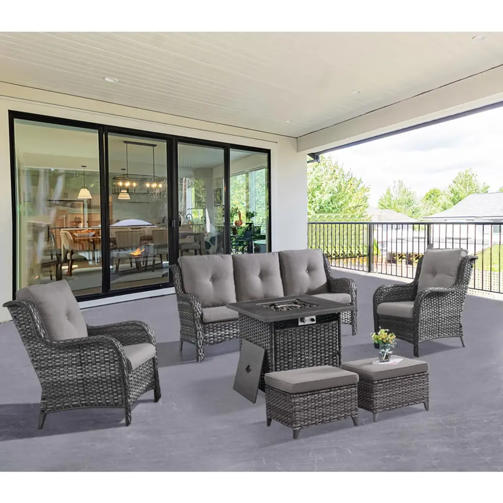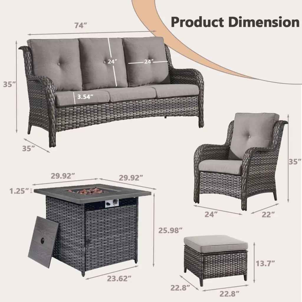 Pocassy 6Pcs Patio Furniture Set With Square Fire Pit Table, All Weather Wicker Outdoor Conversation Set With Sofa, Patio Chairs, Firepit And Ottoman