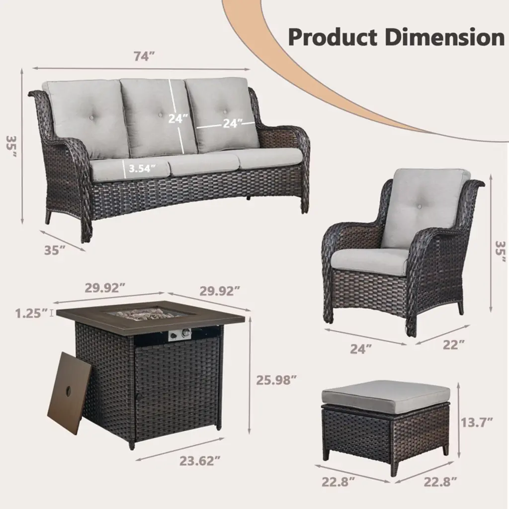 Pocassy 6Pcs Patio Furniture Set With Square Fire Pit Table, All Weather Wicker Outdoor Conversation Set With Sofa, Patio Chairs, Firepit And Ottoman