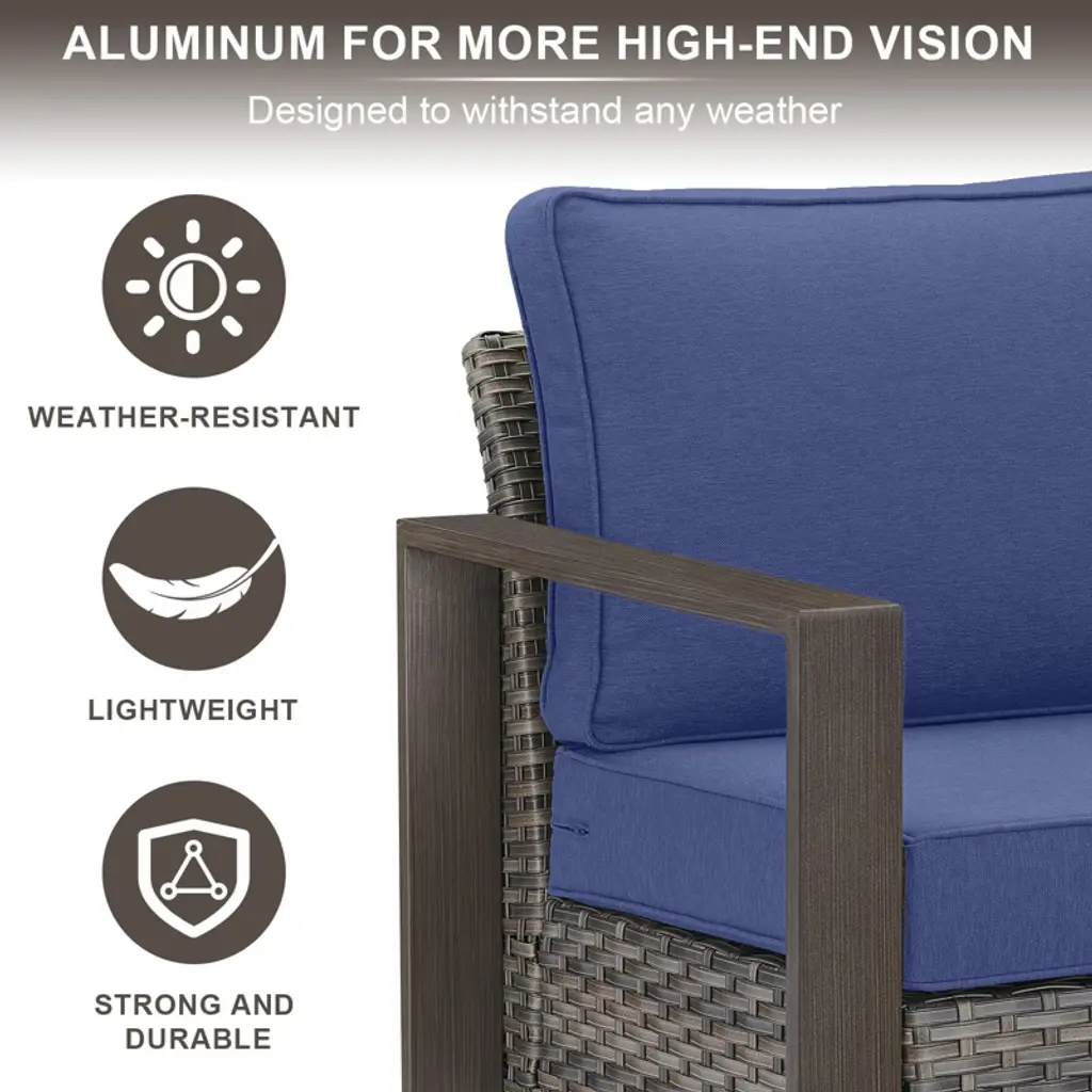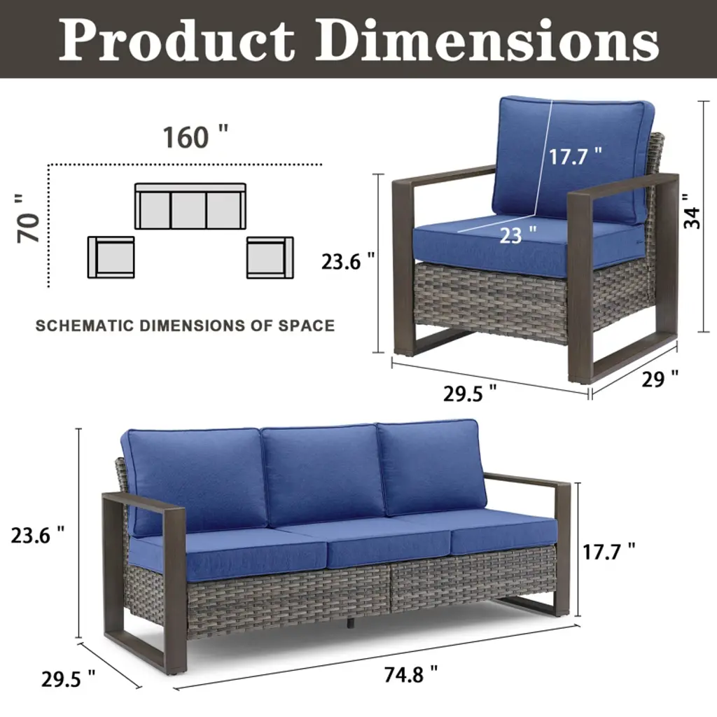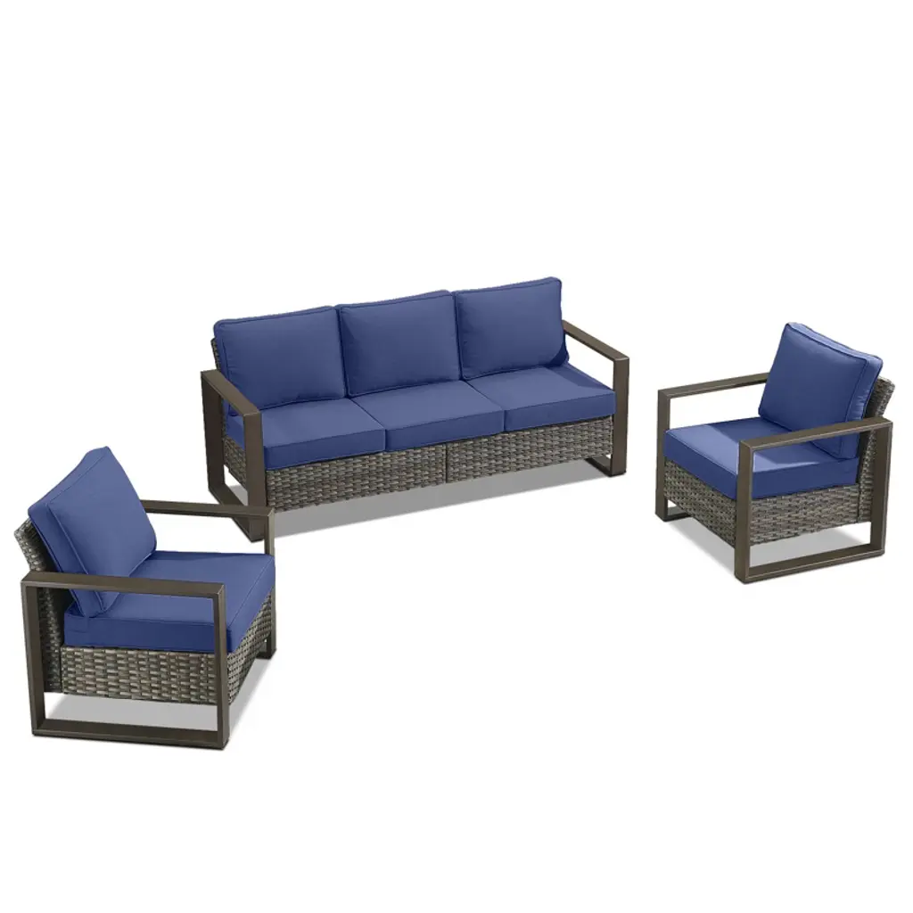 Elevate your outdoor living space with this stylish and practical wicker furniture set. Featuring a spacious 3-seater sofa and two patio chairs, each piece is designed with modern square-shaped faux wood metal armrests for a sleek, contemporary look. The cushions offer superior comfort, with back cushions made of 100% polyester fiber and seat cushions crafted from a blend of 87% polyurethane foam and 13% polyester fiber batting!aall wrapped in durable, weather-resistant Olefin fabric. The handwoven PE wicker adds a refined touch, while the sturdy square legs ensure lasting stability and support.