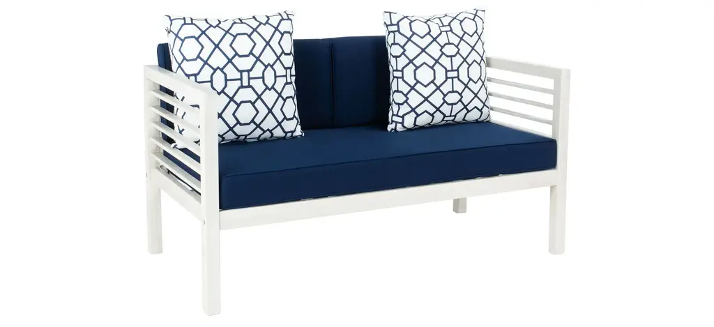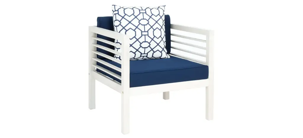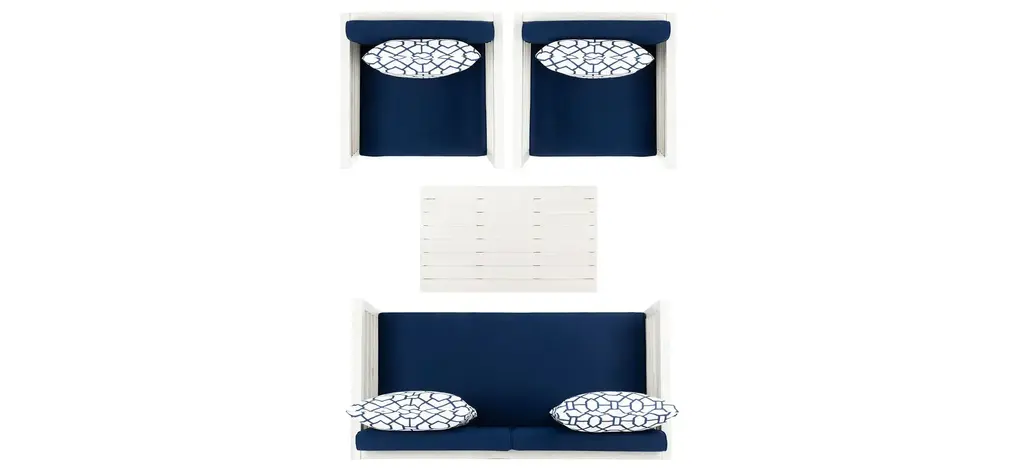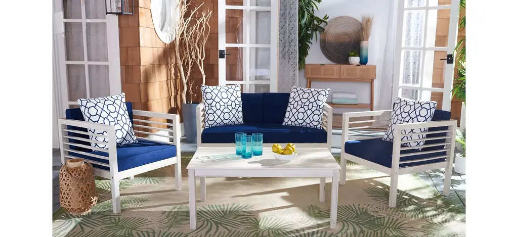 Inspired by Barcelona's coastal style, the contemporary Samana 4-pc. Patio Set is a new classic. Designed with chic clean lines, each piece is crafted in a neutral natural hue and upholstered for timeless appeal. It also features bold accent pillows in a complimentary color.