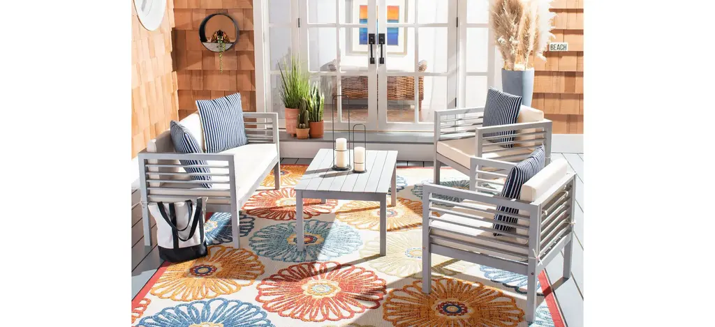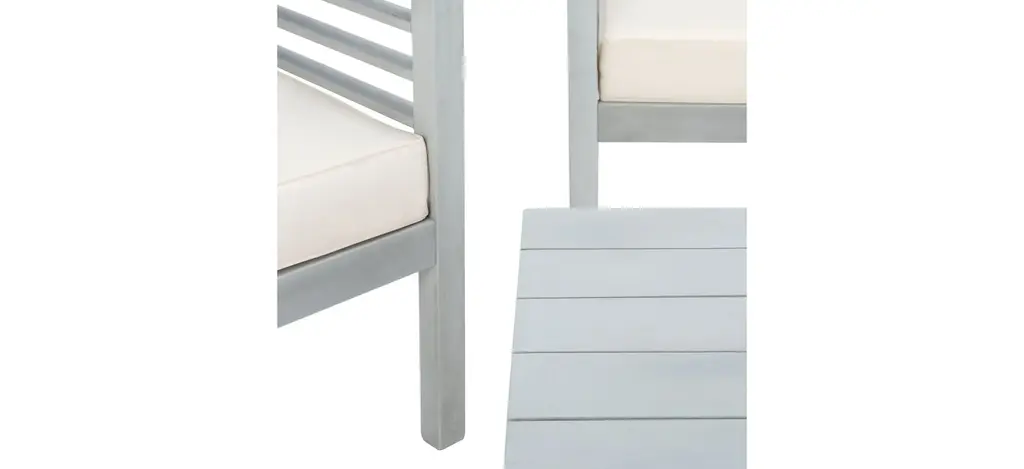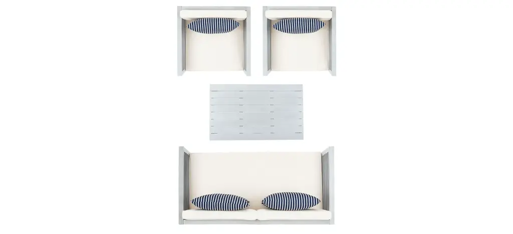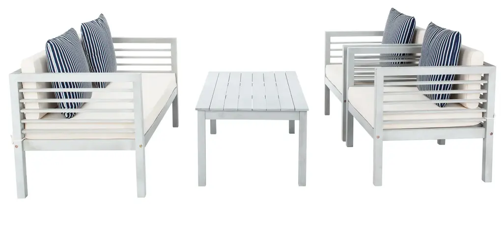 Inspired by Barcelona's coastal style, the contemporary Samana 4-pc. Patio Set is a new classic. Designed with chic clean lines, each piece is crafted in a neutral natural hue and upholstered for timeless appeal. It also features bold accent pillows in a complimentary color.
