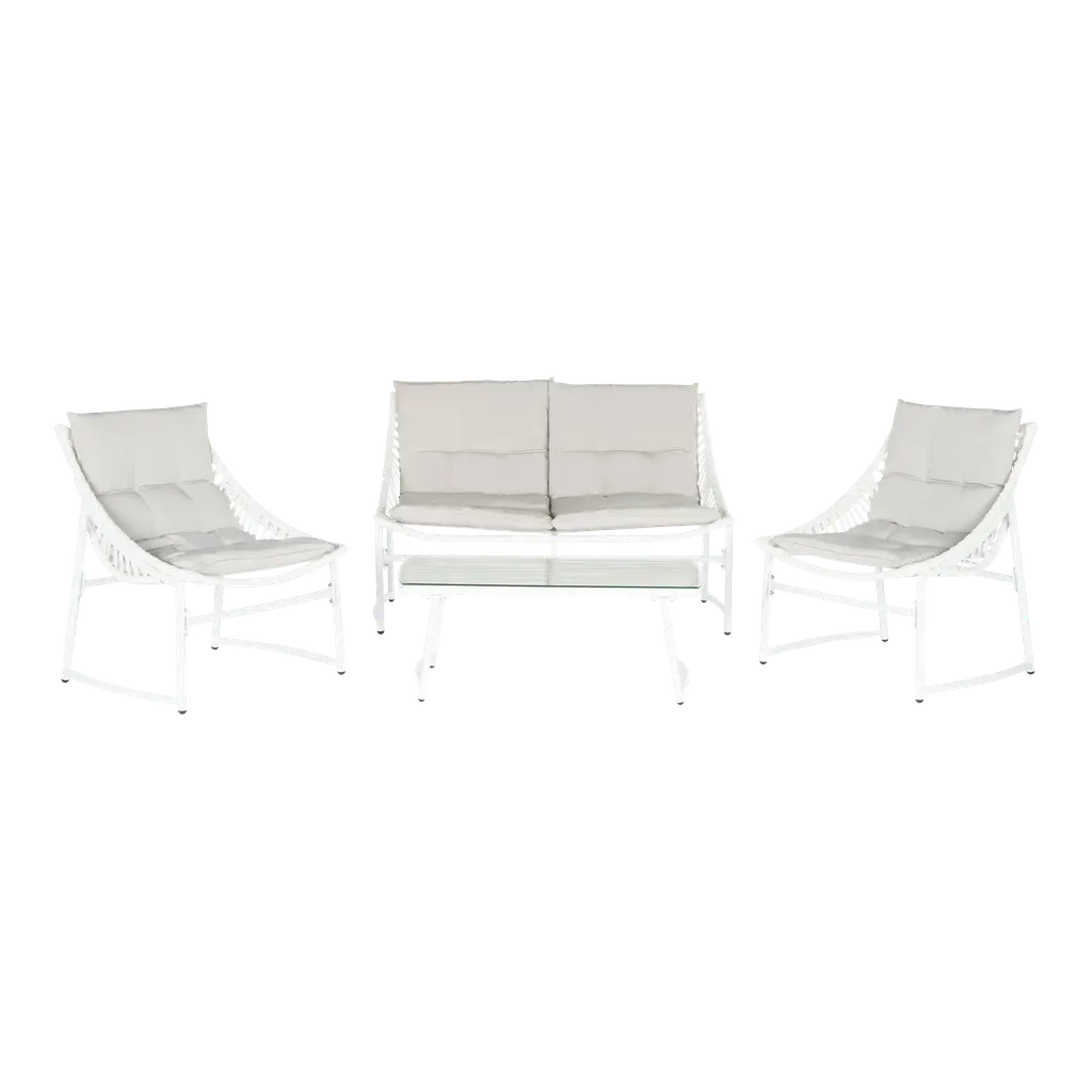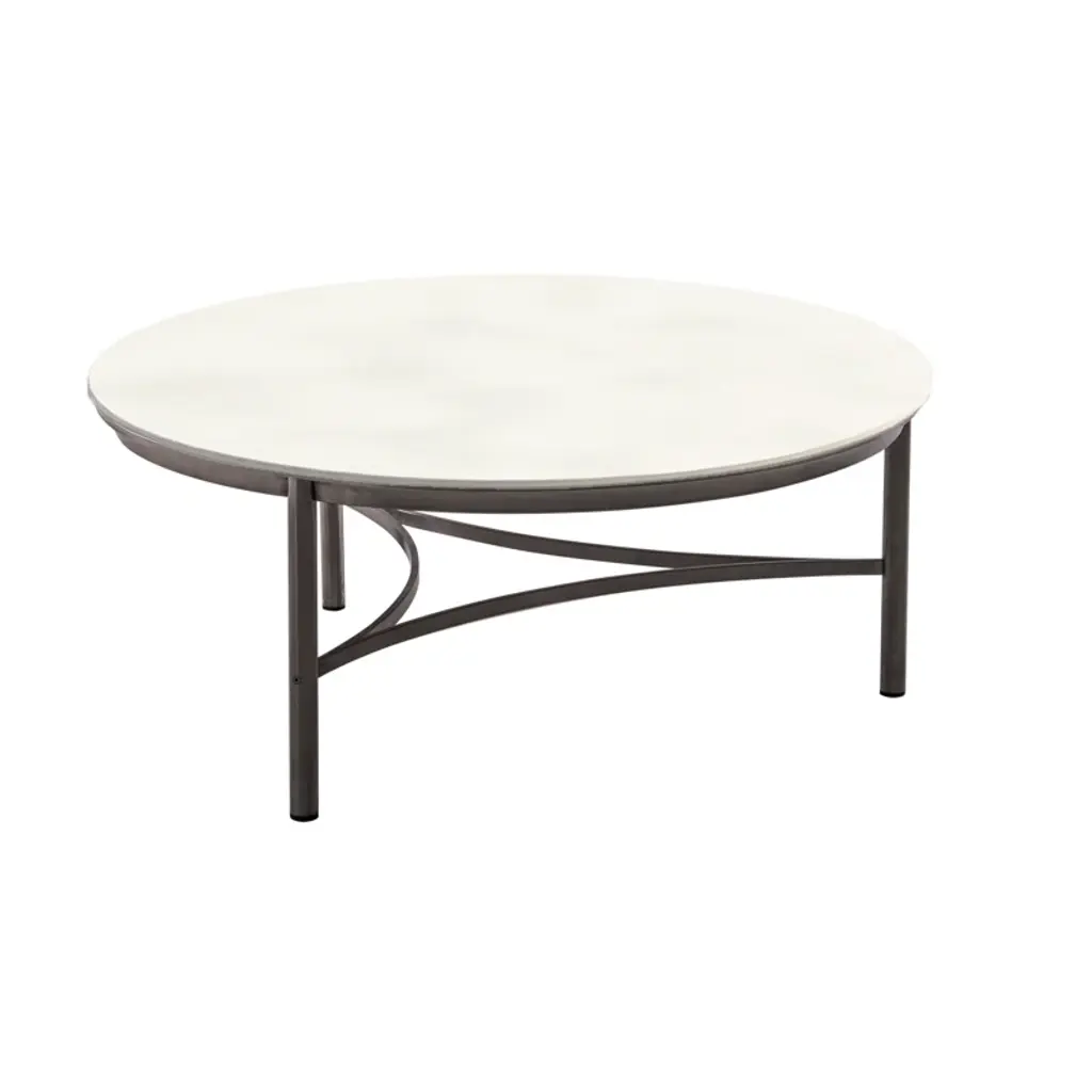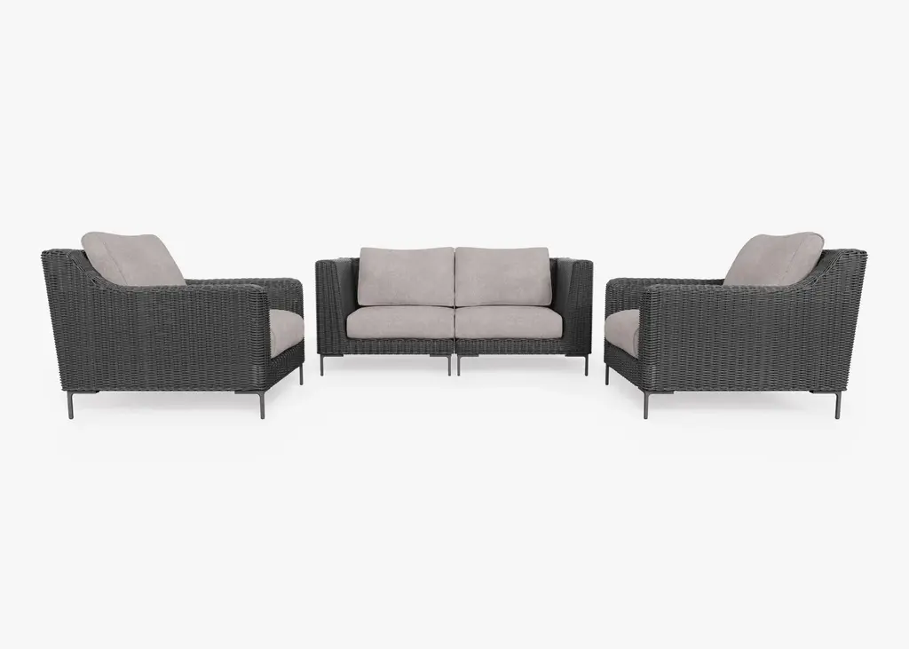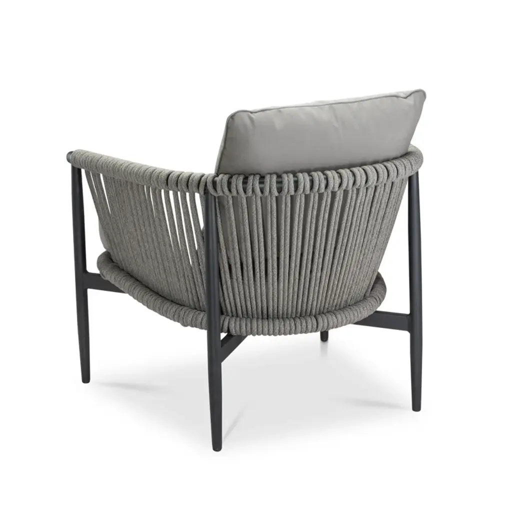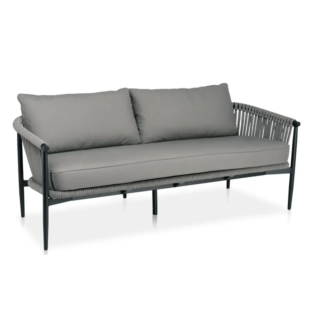 The Sasha sofa and club chairs are a great addition to your outdoor entertaining space. With a black frame, sandstone rope, and a wide sloped back, it is comfortable for enjoying a summer barbeque in your backyard. A plush cushion in spectrum graphite is included. This set also includes the stylish and functional ceramic top Sasha round coffee table. The ceramic top in winter along with the black powder-coated stainless steel base coordinates well with the Sasha sofa and club chairs.