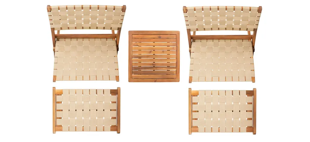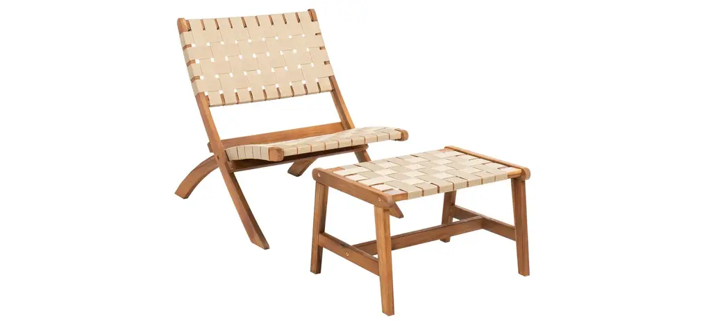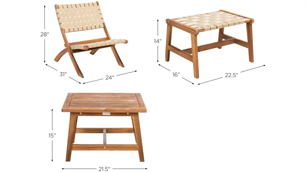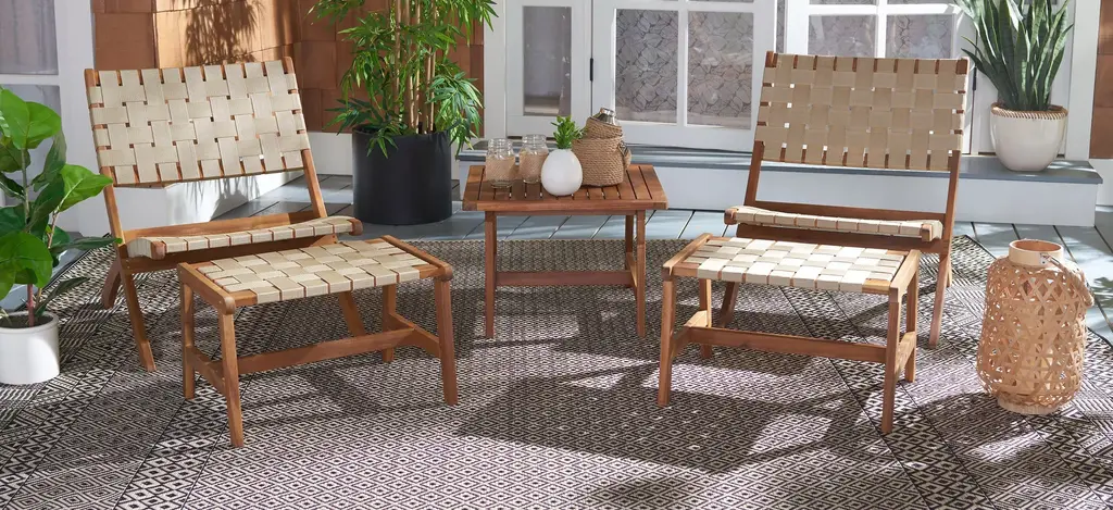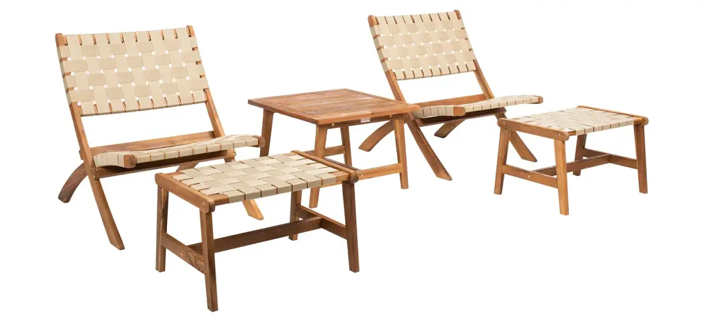 Stretch out and enjoy the summer breeze with this Shea 5-pc. Patio Set. Two natural finished acacia wood chairs and matching ottomans allow for lavish lounging in the sunshine, and an end table provides ample space for coffees, cocktails, or snacks.