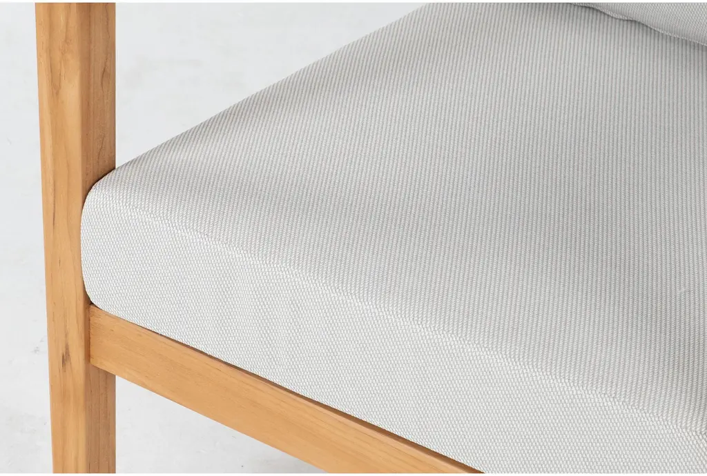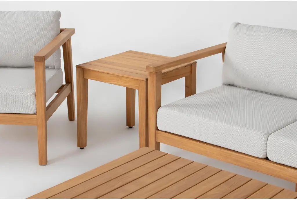 With our Solana Natural Teak outdoor conversation set in your backyard, you can expect to enjoy many years of enduring beauty, durability and integrity. Each patio design features FSC®-certified 100% solid teak sourced from the Republic of Panama and comes from a responsibly managed forest that meets strict environmental, social and economic standards set by the Forest Stewardship Council. Naturally resistant to weather and insects, the wood boasts a warm golden-brown color that ages gracefully, developing a silver-grey patina over time. It's been treated with a sealer, which should be reapplied every six months in order to maintain the original hue as best as possible. Comfy foam cushions are upholstered in a water-repellant fabric that is 15K double-rub rated.