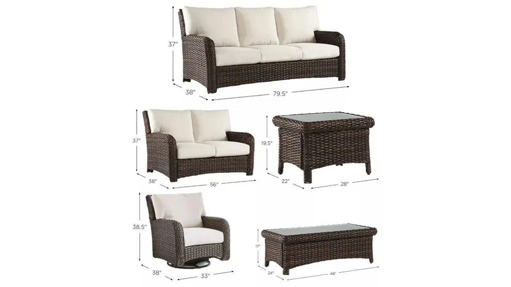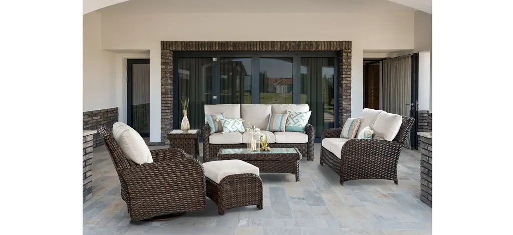Timeless appeal meets a clean, modern aesthetic in the St Tropez 5-pc. Patio Set. The perfectly proportioned Saint Tropez Collection features rustproof aluminum framing. Mold and mildew resistant cushion cores are layered, high-density poly fiber and dry conjugate blend. Each seat has an independent suspension. Crafted with high-density polyethylene synthetic wicker,handwoven over fully-welded powder-coated aluminum framing. Included in this complete patio set is a chair, loveseat, sofa, coffee table and an end table.
