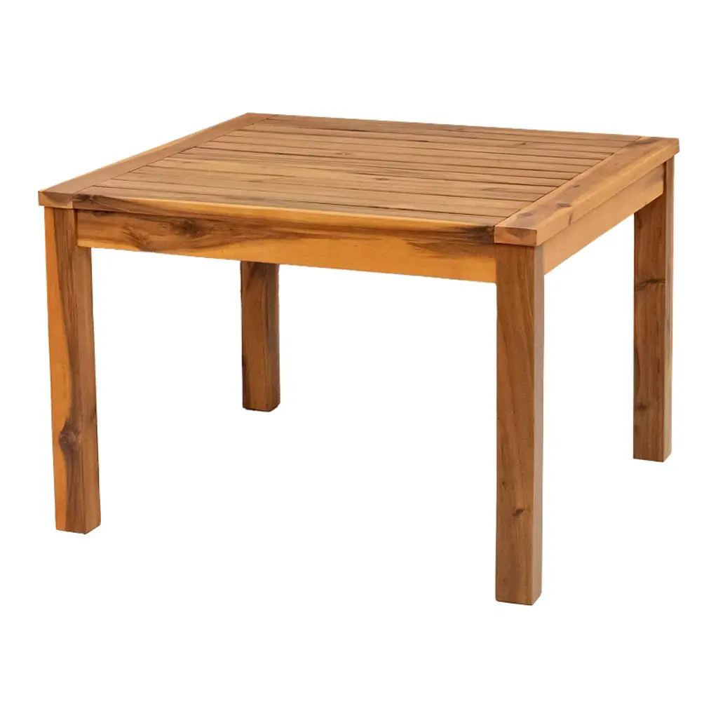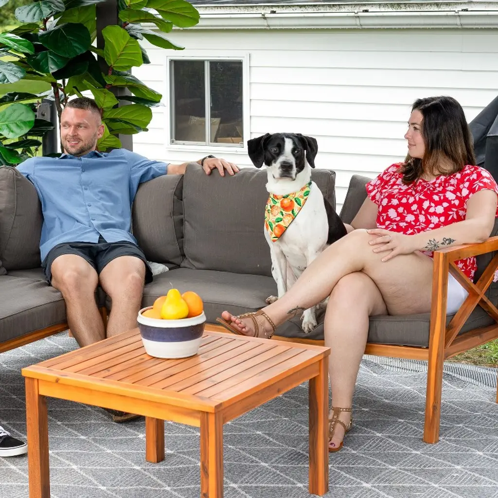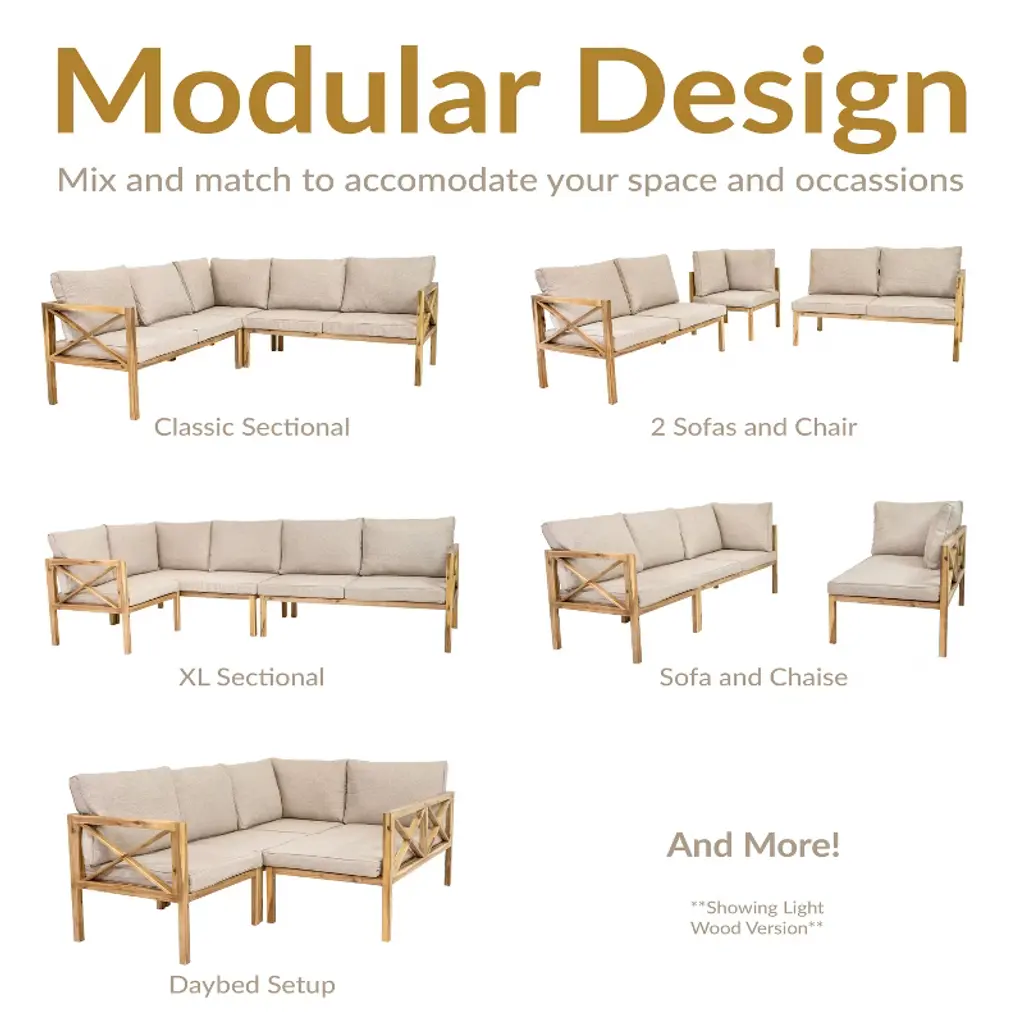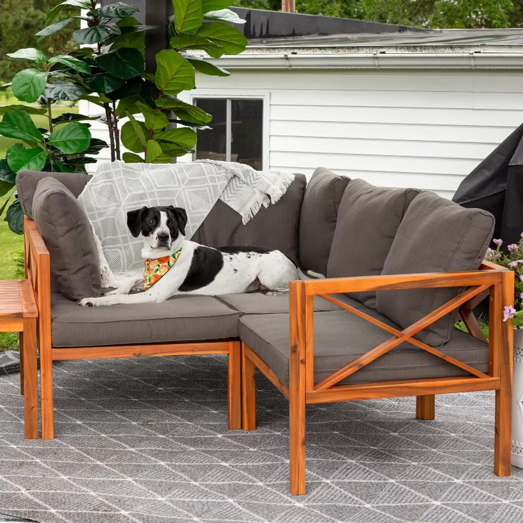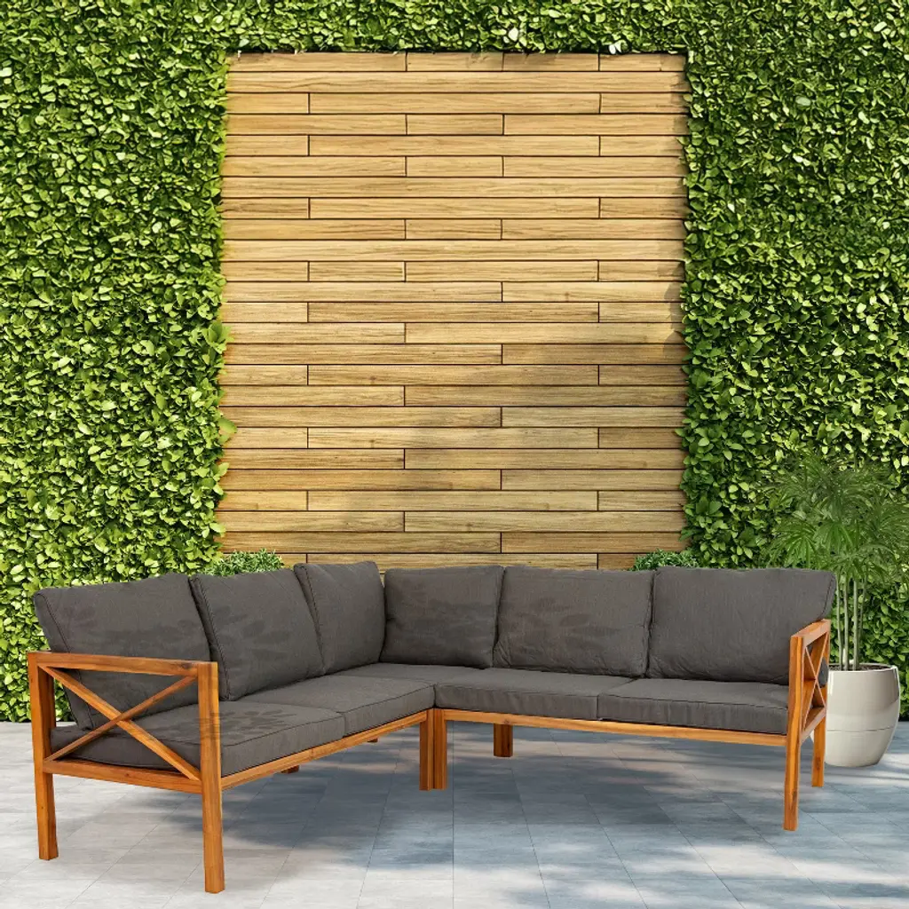 Relax and chat with friends with this stylish outdoor conversation set. This sophisticated wooden patio furniture set is a wonderful place to gather friends for your next backyard party or barbecue. The set includes a cozy outdoor L-shaped outdoor couch and a convenient coffee table. It provides a cozy place for 4 people to sit and chat. Featuring a stylish acacia frame and 100% polyester cushion covers, this sturdy collection is built to last. The back cushions feature a 100% polyester fill and the seat cushions feature a 90% polyester and 10% polyurethane foam for cozy comfort. Available in two classic, neutral shades, the fabric and natural wood finish are sure to complement any decor style and pair well with existing furniture and garden decor pieces. This lovely set will make a stylish addition to the patio, backyard, or deck.• SPACIOUS OUTDOOR SEATING FURNITURE: This sectional measures 80" W x 80" D x 32" H. The arms measure 25.5" H and the seat is 16.5" H. The backs measure 73.5" W x 18" H on each side of the sectional. It has an 11.25" H clearance height and each side has a 700 lb capacity. The coffee table measures 25.75" W x 25.75" D x 17.75" H and weighs 14.2 lbs. The tabletop is 0.75" thick with a 2" apron and a 15.25" H clearance height. It has a 120 lb capacity. Each seat cushion is 25.5" square x 3.5" thick.• STURDY DESIGN AND MULTIPLE CONFIGURATIONS: The sectional consists of 3 solidly built pieces that can be arranged in a variety of ways to provide seating options for any yard or patio. Each side sectional piece weighs 34.5 lbs and the corner piece weighs 14.2 lbs. The overall unit weighs 83.2 lb if all three pieces are used together. Use the included hook-and-loop fastener straps to easily keep the pieces latched together.• STYLISH AND PLUSH COMFORT: This outdoor couch set adds cozy comfort to any outdoor space. The table and furniture frames are made of sturdy and elegant FSC-certified acacia wood. The cushion covers are made of 100% polyester in a classic neutral color. The back cushion fill is made of 100% polyester and the seat cushions feature a 90% polyurethane foam pad and 10% polyester fiber batting fill for extra cozy comfort.• EASY ASSEMBLY: This outdoor sofa set includes a large corner sectional with a convenient coffee table. No additional tools or hardware are required for assembly• GREAT FOR ENTERTAINING: With enough seating to comfortably accommodate 5 adults, this sophisticated L-shaped patio furniture set is a wonderful addition to the patio, deck, or backyard.