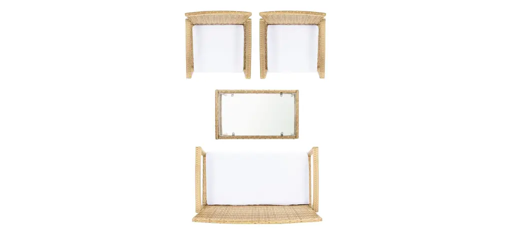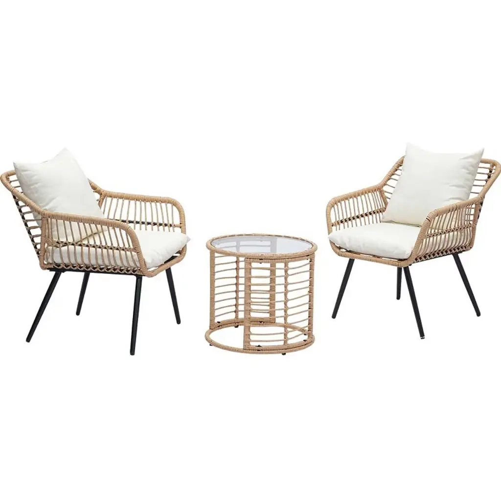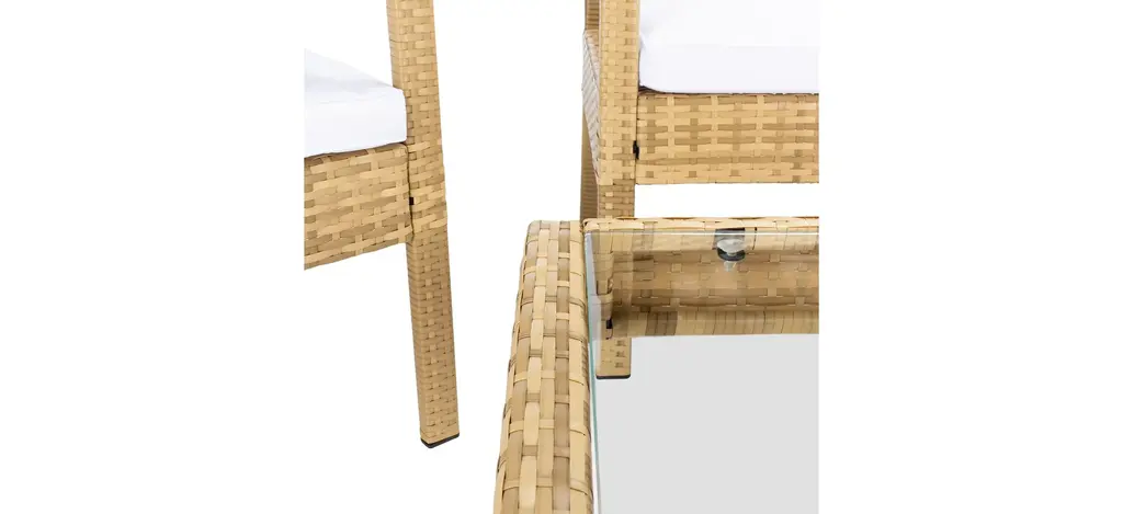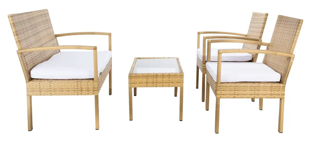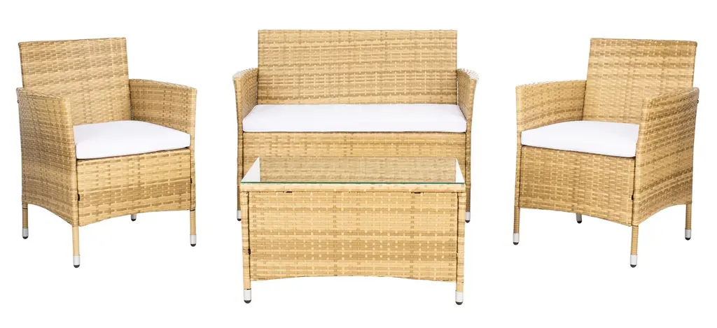 Designed to bring a tropical resort vibe to your porch or patio, the Thessaly 4-pc. Patio Set is extravagant staycation outdoor decor. Thessaly complements any taste or style with its woven frames and matching cushions. Its glass topped coffee table is ideal for holding candles, drinks, or canapes as you relax the day away.
