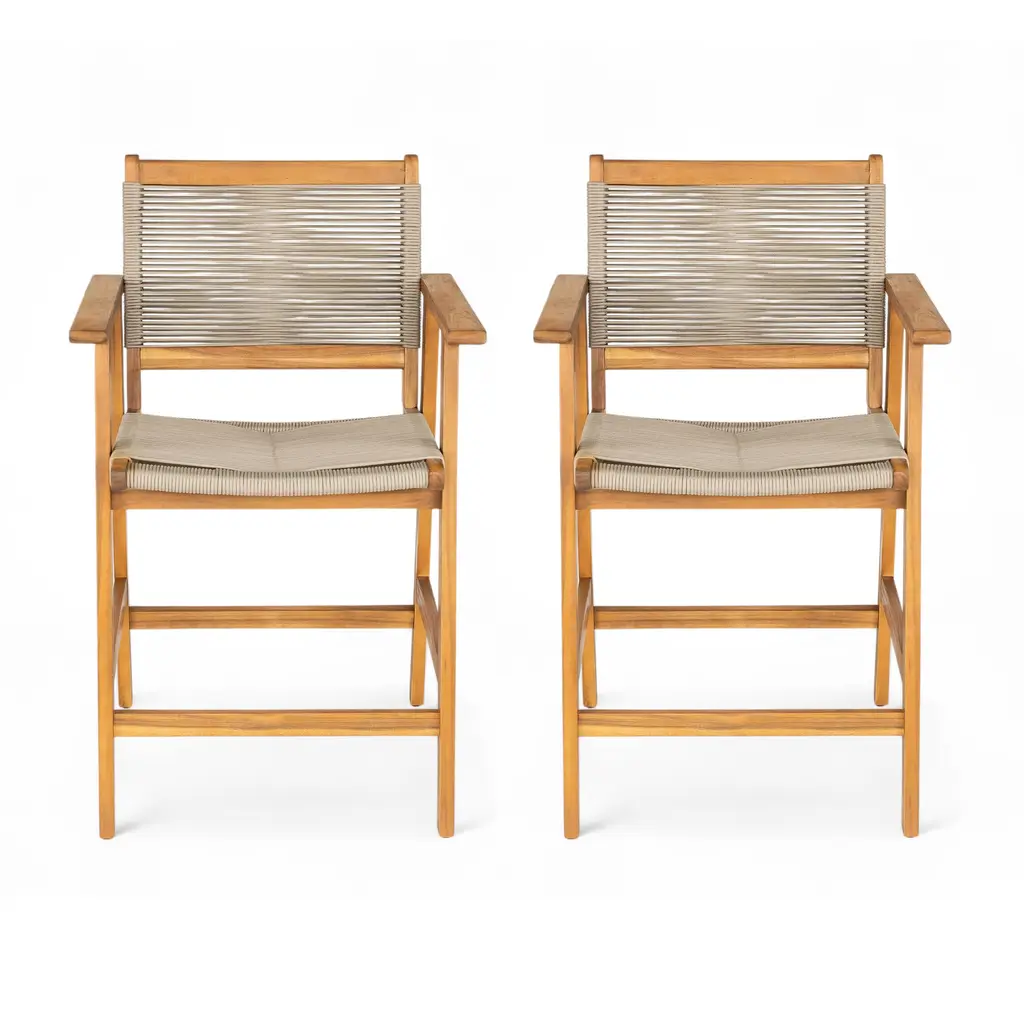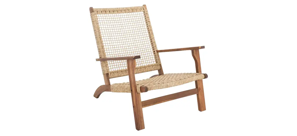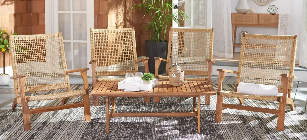 Tropical resort style comes to your porch or patio with this coastal Tilden 5-pc. Patio Set. Lounge with family and friends in the warm breeze with Tilden's four coastal chic chairs in warm natural acacia while enjoying your morning beverages. Designers love its light woven rattan. Includes rectangular coffee table.