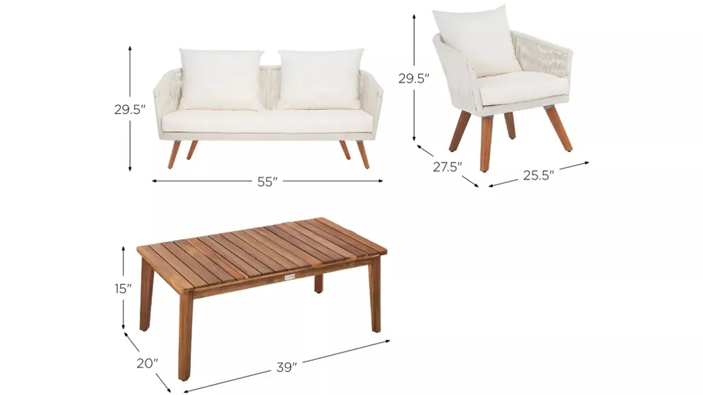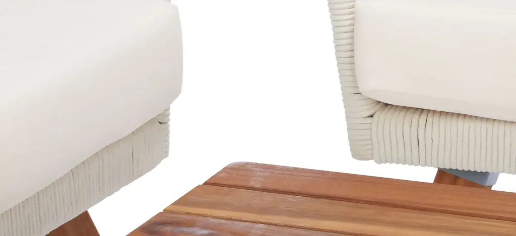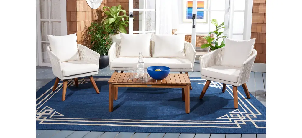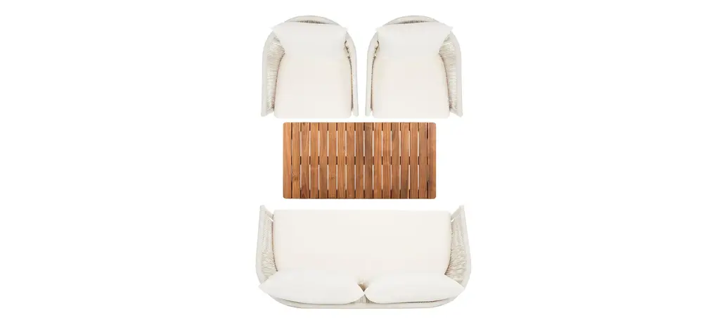 Create the ultimate stay cation with this Velso 4-pc. patio set. Designed to bring luxe boho style to any outdoor space, the modern curves and lines on its lush settee, armchairs, and table are crafted with natural finished acacia wood and soft rope. Beige cushions provide flawless comfort.