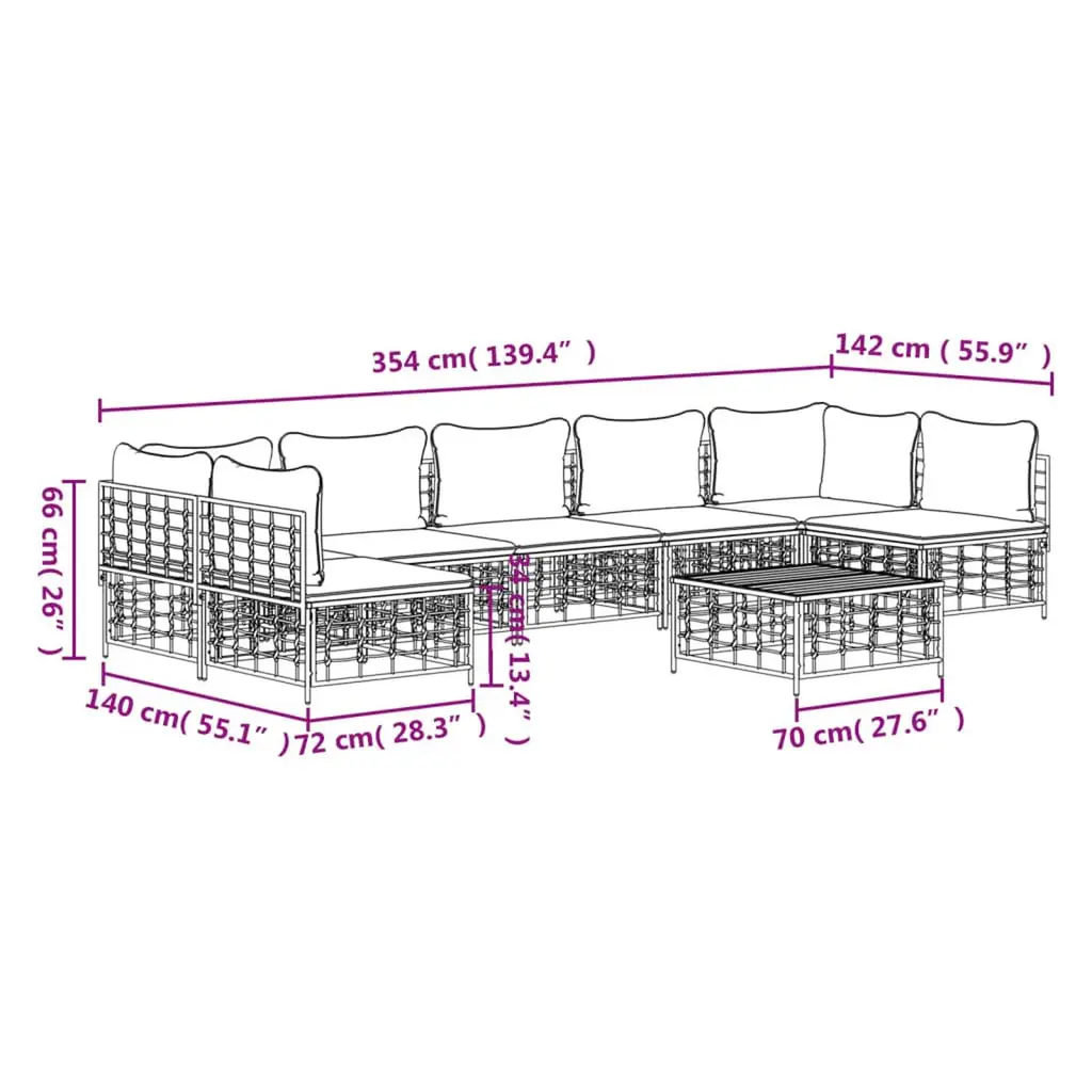This 8-piece garden lounge set is all about modern style and practicality, perfect for turning your outdoor area into a comfy retreat. It fits right into patios, balconies, or gardens, giving you loads of space for chilling out or entertaining friends and family. Modular Sections: You can mix and match arrangements to suit your space and style.Comfortable Cushions: Comes with 16 soft cushions that have zipper closures for easy cleaning and getting comfy.UV-Resistant Materials: Made from high-quality poly rattan that doesn’t fade in the sun, promising great looks for years.Durable Frame: The powder-coated steel frame offers solid support, allowing you to relax safely outdoors.Stylish Design: The sleek anthracite color and smooth finish make this lounge set a standout in any outdoor setup.