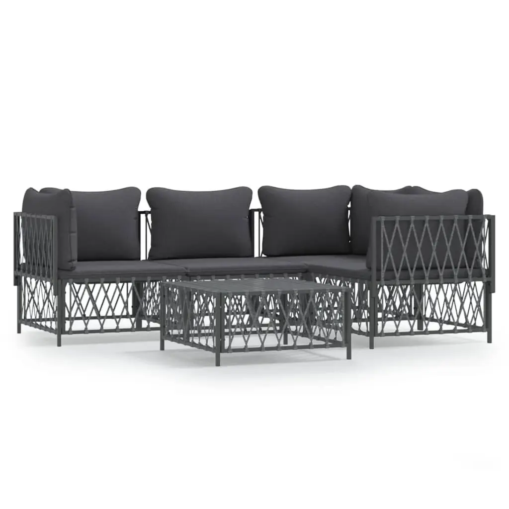 This posh 5-piece modular garden lounge set has a trendy design that's perfect for sprucing up any outdoor area, like a balcony or patio. It includes two corner sofas and three middle sections, all made from high-quality poly rattan and tough powder-coated steel, blending style with durability for your outdoor parties. Modular Flexibility: The modular design lets you rearrange the seating arrangement easily to fit your space and style. Shuffle the segments to make comfort a priority when hosting or having a quiet night in.Weather-Resistant Construction: Made from UV-resistant materials, this lounge set keeps your investment looking good against the elements, keeping its style and function over time. Use a waterproof cover to protect it and extend its life during bad weather.Comfortable Seating: Each seat cushion is made from weather-resistant fabric, giving you and your guests a comfy experience, suitable for any season.Easy Care: The removable cushion covers have a zipper for easy cleaning, so you can keep your outdoor furniture looking fresh with no fuss. Just a damp cloth is enough for keeping the rattan surfaces spotless.Stylish Aesthetic: The anthracite grey color fits in with modern decor while adding a sleek vibe that enhances any garden or patio setup. It’s a striking addition that’s not just easy on the eyes but highly practical too.