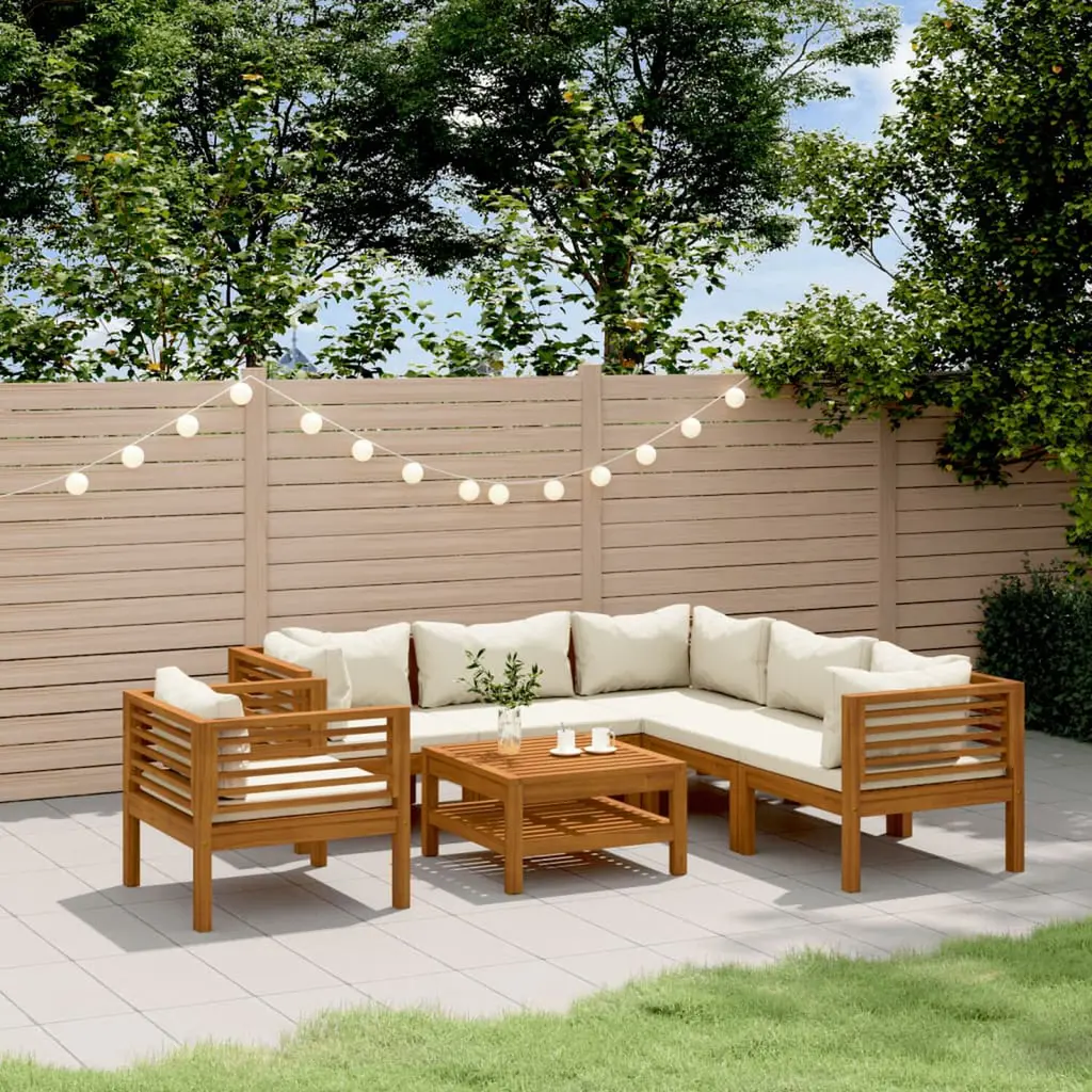 This 7 Piece Modular Garden Lounge Set is the ultimate in modern outdoor living, with brilliant craftsmanship that mixes functionality and style. Built from solid acacia wood and featuring comfy cream cushions, it creates a laid-back, inviting space that’s perfect for unwinding or having friends over. The modular design lets you easily change things up, making it a versatile addition to any outdoor spot.Each cushion comes with a sturdy zip closure, keeping them secure and easy to clean for hygiene and durability.Crafted from solid acacia wood, known for its strength, this set can handle different weather, keeping it looking great through the seasons.The oiled finish not only protects from moisture but also showcases the wood's natural beauty, making it a lovely fit for contemporary outdoor decor.This lounge set is all about outdoor fun, seating up to 7 people, making it ideal for gatherings, family BBQs, or cozy evenings under the stars.