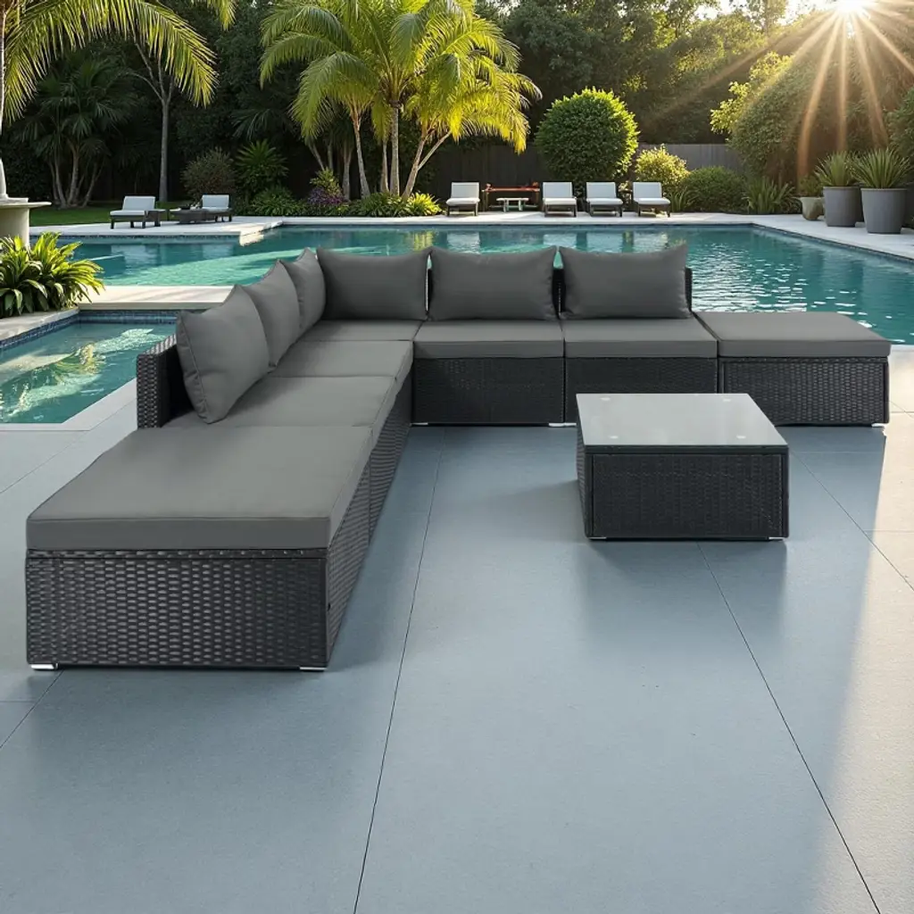 This 8-piece garden lounge set is a great pick for any outdoor area, mixing modern style with practicality. With its trendy dark gray rattan finish and comfy black cushions, it’s spot on for hanging out with friends or enjoying a laid-back evening on your patio. The lounge set is made from weather-resistant PE rattan, so it’s built to withstand various outdoor conditions.Comfortably fits up to seven people, perfect for gatherings or family time in your garden.Chic contemporary design adds to the beauty of balconies, patios, or terraces.The removable cushions offer extra comfort while making cleaning a breeze.Features a solid powder-coated steel frame for stability, giving you peace of mind during daily use.