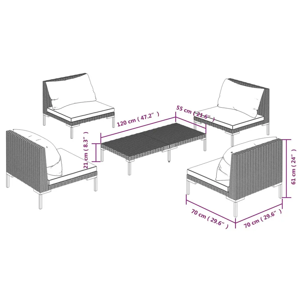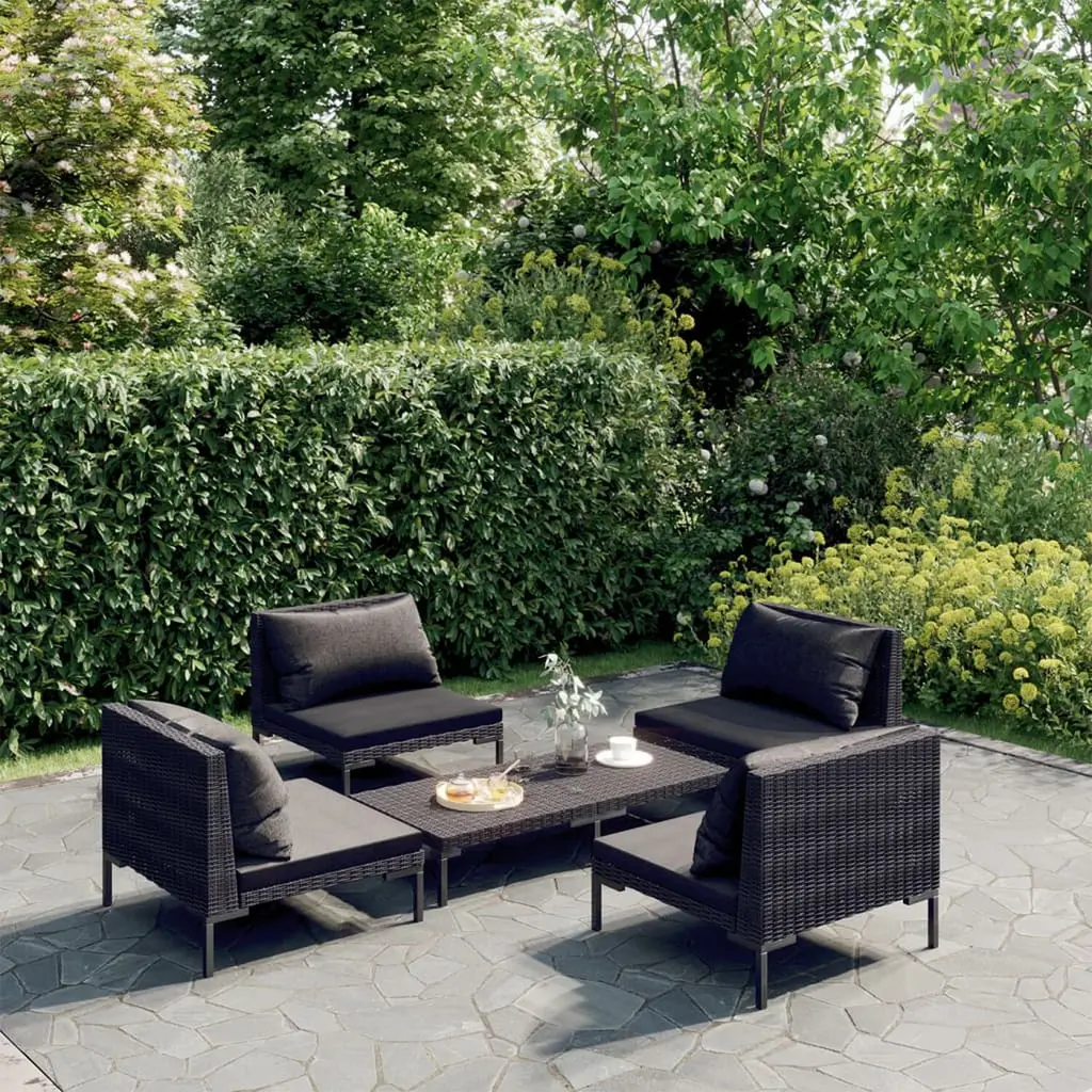 This 5 Piece Garden Lounge Set with Cushions makes for a lovely outdoor area to relax, whether you’re hosting or enjoying some me-time. It's designed for modern comfort, and the dark grey poly rattan fits perfectly with any patio or garden vibe, making it a must-have to perk up your outdoor space. With plenty of room for family and friends, it combines style and functionality beautifully. Durable Construction: The lounge set is made from weather-resistant PE rattan, so it's made to last. It's perfect for outdoor use, whether it's on patios, in gardens, or on balconies.Comfortable Cushions: Each seat comes with removable cushions made from quality polyester fabric, ensuring your lounging is a pleasure and making cleaning super easy.Modern Aesthetic: With a sleek, clean design, this lounge set fits right into modern outdoor spaces, providing a touch of elegance while keeping you comfy.Easy Assembly and Maintenance: It requires assembly, but it's quick to put together with just two people and a screwdriver. Cleaning is a cinch—just use a damp cloth to keep it looking sharp, making it practical for everyday use.Generous Seating Capacity: The set seats four adults comfortably, perfect for family gatherings or just chilling out. Its layout is great for entertaining guests or for quiet chats over drinks.