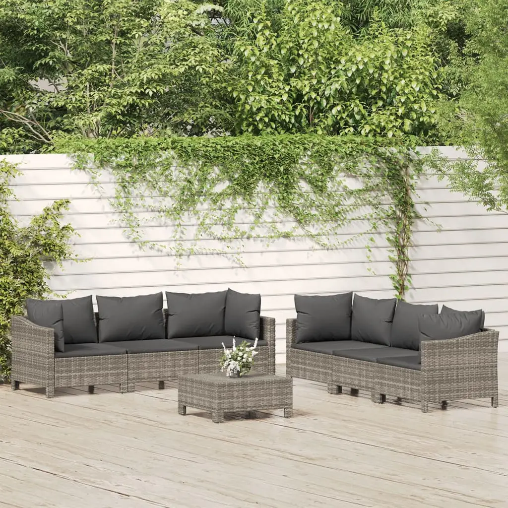 This 7-piece Modular Garden Lounge Set is just the ticket for outdoor chilling, with a design that fits perfectly on your balcony or in a sunroom. With its smooth, gray PE rattan finish and sleek cushions, it's all about elegance and comfort. It's perfect for parties or lazy afternoons in the garden. Durability: Crafted from weather-resistant PE rattan and tough powder-coated steel, this lounge set can take on the weather and last ages.Flexible Design: Change things up with the modular design, so you can rearrange it however you like, perfect for any occasion.Comfortable Cushions: Comes with plenty of thick, removable cushions made from outdoor fabric, giving you top-notch comfort and boosting the style.Aesthetic Appeal: The sleek, modern design with a classy gray color freshens up any outdoor space and creates a chill vibe.Easy Maintenance: Just cover it when you're not using it, and a damp cloth will do for cleaning—easy peasy!