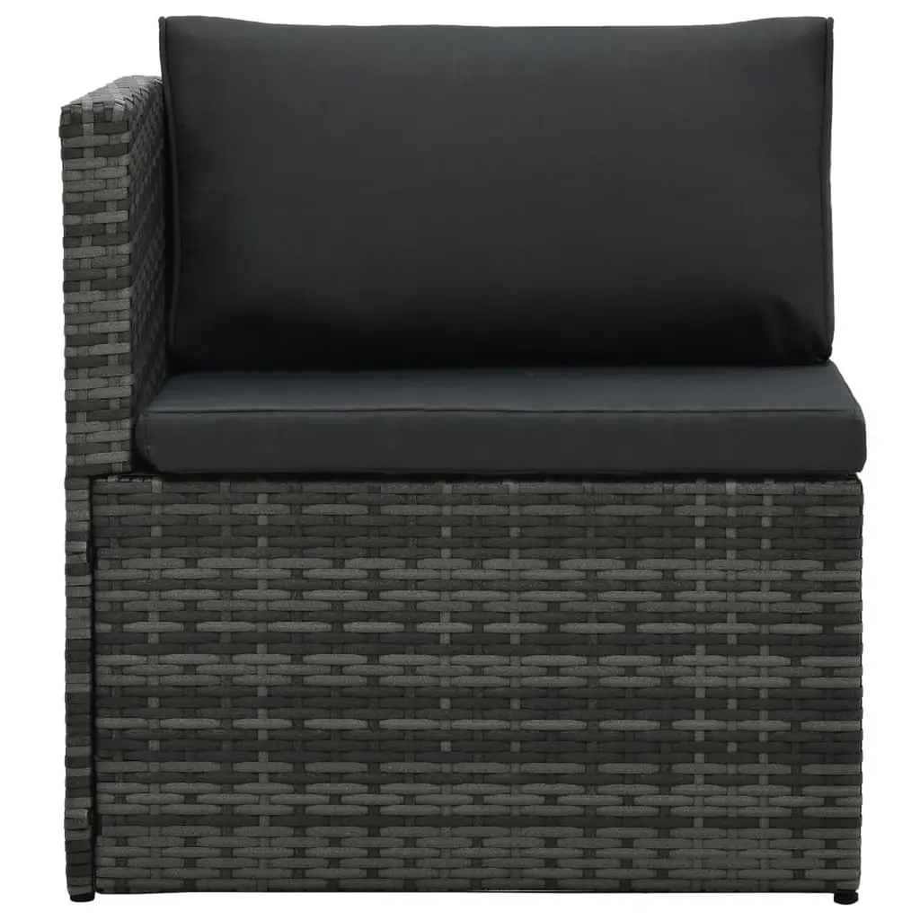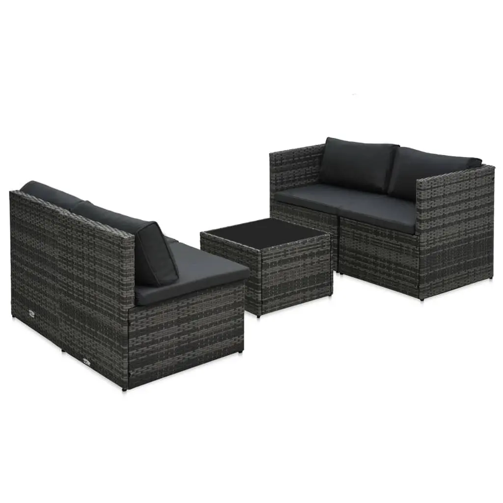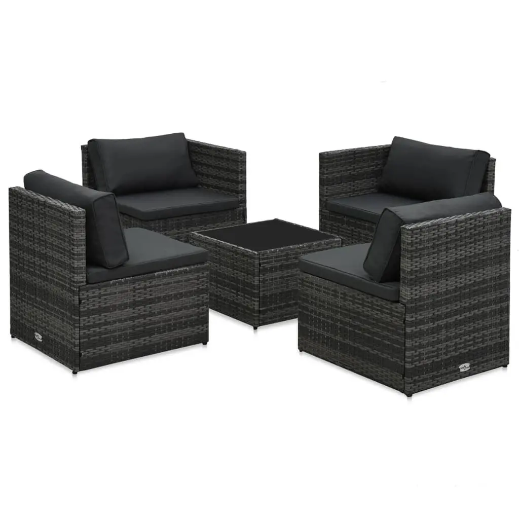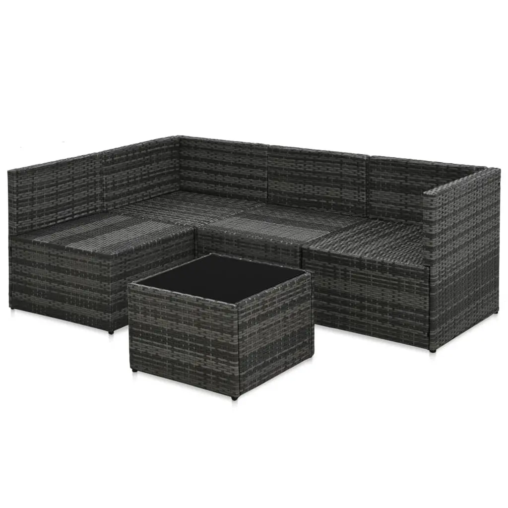 This 5-Piece Garden Lounge Set is a fab add-on to your outdoor area, blending style and comfort for proper relaxation. Perfect for get-togethers or chilling out, this contemporary lounge set adds a sleek, practical look that boosts the vibe of patios, porches, and balconies. Modular Design: The lounge set has a reconfigurable modular design, so you can customize your seating to fit any space just right. You can easily change it up for different occasions, whether hosting friends or enjoying a quiet night. Weather-Resistant Materials: Made from synthetic poly rattan, this set can tough it out against bad weather and still look good. The materials are built for durability, ensuring it lasts without losing its style. Comfortable Seating: The plush polyester cushions add comfort, making it ideal for long lounging sessions. They bring depth and coziness, inviting you to chill out and enjoy the outdoors. Modern Aesthetic: The sleek lines and understated color of grey and anthracite deliver a chic look that suits any outdoor setup. This style's not just practical but adds a classy touch to your garden, patio, or balcony. Easy Maintenance: Thanks to weather-resistant materials and removable cushion covers, keeping this garden lounge set looking fresh is a breeze. Just a regular clean is enough to keep it inviting, making it great for busy lifestyles.