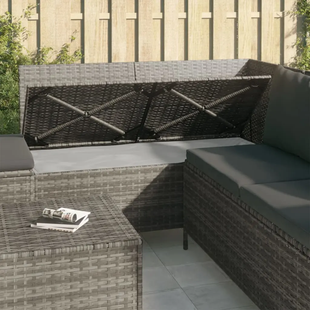 This 4 Piece Garden Lounge Set offers a stylish solution for outdoor relaxation, designed for both looks and functionality. It includes a corner sofa, stool, and coffee table, all featuring soft cushions that invite you to kick back and enjoy the outdoors. Ample Storage: A key highlight of this lounge set is its generous storage space—perfect for keeping garden essentials easily accessible but neatly stored away. This feature maximizes the functionality of your outdoor area and keeps it clutter-free.Weather-Resistant Material: Made from durable Poly Rattan and powder-coated steel, this furniture set is built tough to handle the elements. This quality guarantees long-lasting use and performance through various weather conditions, keeping its charm for years to come.Comfortable Cushions: Each seat comes with soft, removable cushions that enhance comfort while lounging. The cushions are water-resistant, designed to protect against spills and easy to clean whenever needed.Contemporary Style: The sleek, textured finish of the lounge set adds a modern touch to your garden. Its appealing grey color fits right in with any outdoor decor, making sure your space looks stylish.Versatile Use: Seating up to four, this garden lounge set is perfect for gatherings, friendly chats, or serene relaxation in your backyard. The arrangement offers multiple seating options, making it a fantastic addition to your outdoor living area.