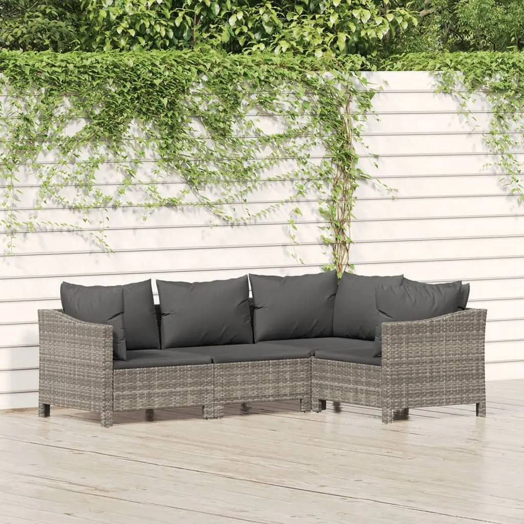This 4-piece outdoor garden lounge set is all about style and comfy living, making it perfect for your balcony or patio. With its modern sleek grey design, it's a welcoming spot for family and friends to chill, chat, or just enjoy the great outdoors. The modular design gives you the freedom to rearrange the pieces, making it fit for any outdoor setting.Made from weather-resistant PE rattan, this set is built to take on the elements while staying looking good.Plushly padded with removable outdoor cushions, these cushions use soft, breathable fabric for extra relaxation.The elegant grey color adds a modern touch to your outdoor decor, blending in nicely with various styles.Each chair can hold up to 242.5 lb, offering sturdy support for multiple users and creating a cozy spot for socializing.