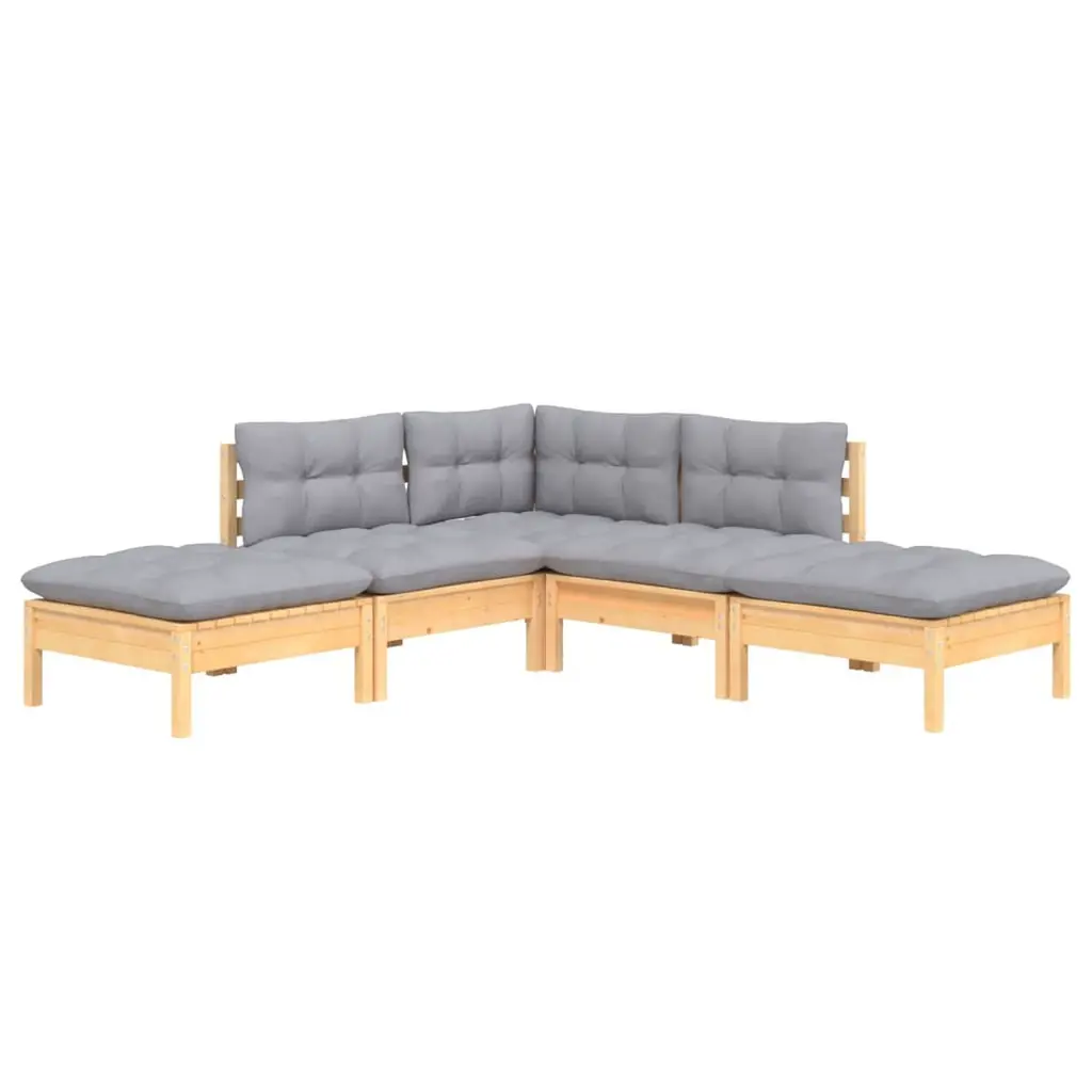 This 5-piece Garden Lounge Set redefines outdoor relaxation, creating a lovely and practical seating area for both gatherings and chill time in your garden or balcony. Made from solid pine wood and soft grey cushions, it’s the perfect spot for entertaining or enjoying lazy afternoons outside, blending style with comfort. 【Modular Design】The modular feature lets you switch up your lounge set, making it fit various spaces and occasions, whether it’s a cozy evening with friends or a laid-back family gathering.【Durable Material】Made from solid pine wood, this set is built to last while providing a natural look that blends well with garden settings.【Included Cushions】Each seat comes with weather-resistant cushions, adding comfort and maintaining their shape for seasons ahead.【Stylish Look】With a sleek design and clean lines, this lounge set isn’t just functional but also elevates the style of your outdoor areas.【Easy Maintenance】The cushions feature removable covers for simple cleaning, so you can keep your set looking great for unexpected get-togethers.