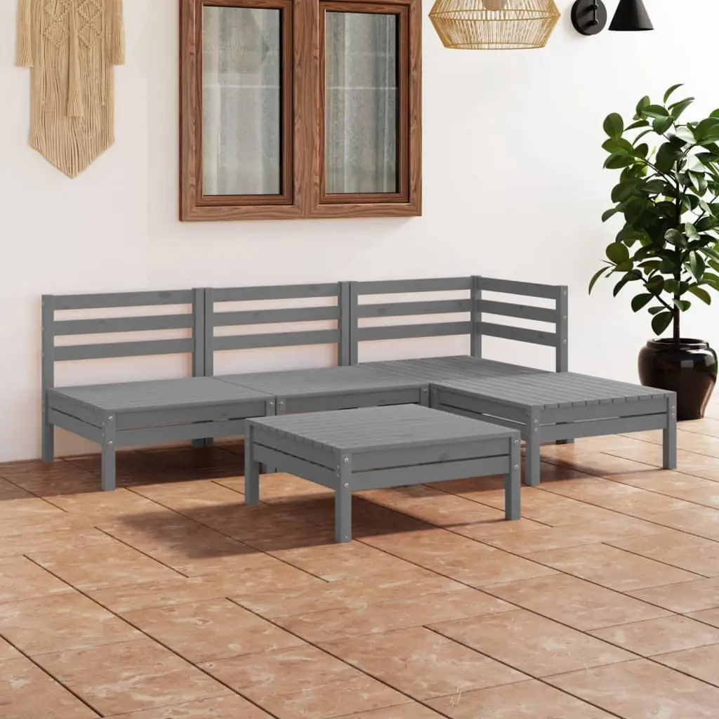 This 5-Piece Rustic Garden Lounge Set is just the thing for a chill spot, whether on a cozy terrace or a spacious patio. With its warm grey finish, it looks great while keeping you comfy for hanging out with friends and family in the summer. The modular design lets you rearrange pieces for different seating setups, perfect for both cozy chats and larger gatherings.Crafted from solid pine wood, this set combines durability with rustic beauty, enhancing your garden or balcony's look.The generous seating capacity makes it comfy for up to 5 people, great for family occasions or catching up with friends.Each piece has a smooth touch and matte finish, offering comfort while looking stylish and modern.You can use it inside or outside, making it a flexible choice for your living room or patio. Just remember to use a waterproof cover when it's not in use for longevity.