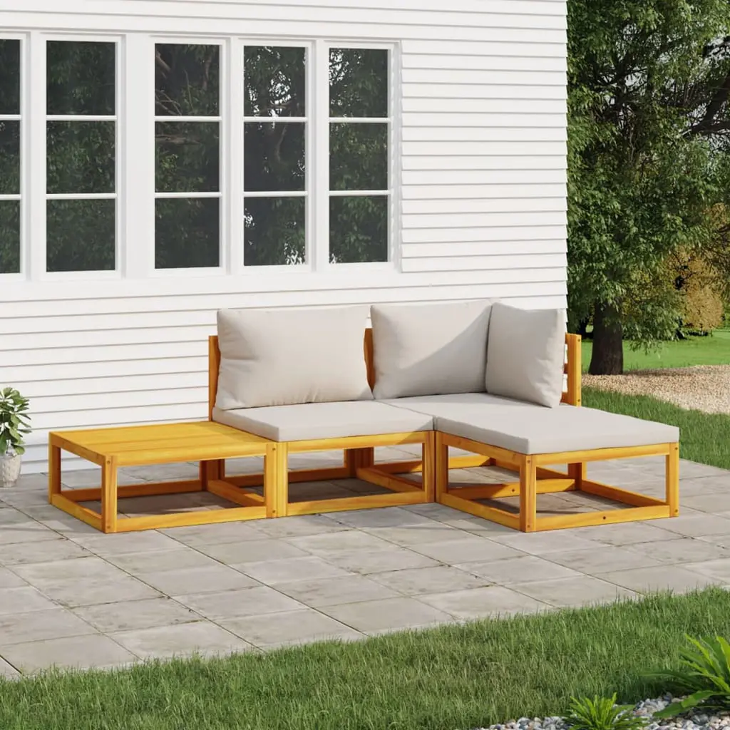 This 4 Piece Garden Lounge Set is a stunning addition to your outdoor space, blending rustic charm with practical design. Ideal for balconies, patios, or gardens, it features a cozy farmhouse vibe with light grey cushions that make it perfect for coffee breaks or chilling with friends. Modular Design: You can arrange it however suits your outdoor space, perfect for gatherings or a quiet coffee break. Durable Material: Made from solid acacia wood for a beautiful, long-lasting piece. UV Resistant Cushions: Light grey cushions resist fading, making your lounging comfy and worry-free. Comfortable Seating: Each piece has removable cushions for easy cleaning, keeping everything fresh for you and your guests. Complete Set: This lounge set includes a corner sofa, a middle sofa, a footrest, and a coffee table, giving you a stylish outdoor seating area.