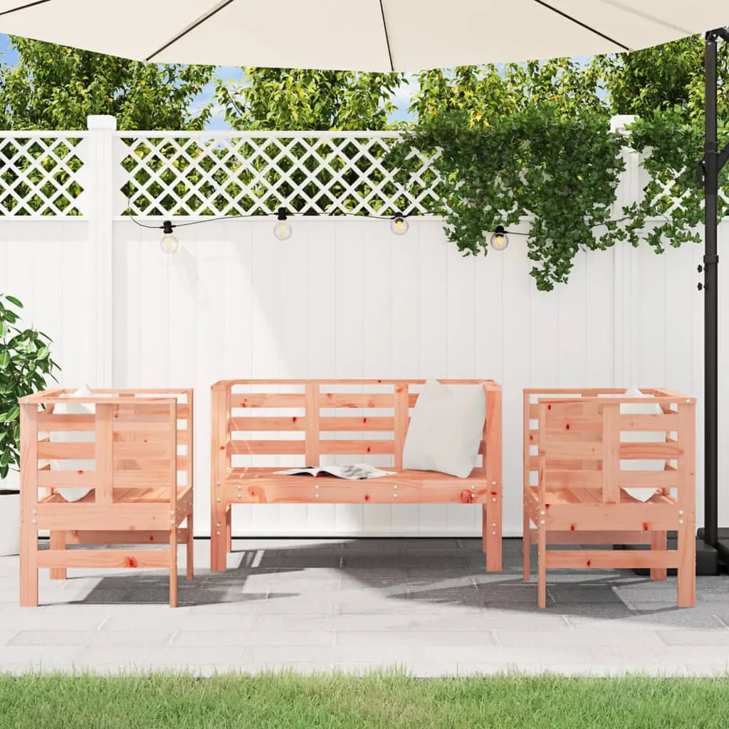 This 3-piece garden lounge set is all about comfort and style, making it your go-to for relaxing outdoors. Made from solid Douglas Fir wood, it fits right in with any garden, balcony, or patio, following that Scandinavian design vibe of keeping it simple yet functional. It looks good and does the job! Sturdy Construction: This garden lounge set is built to last, thanks to its solid wood frame. Douglas Fir wood is tough enough to handle different weather while keeping looking classy.Comfortable Seating: With a roomy bench and two chairs, there's plenty of space for relaxing, fitting up to three people comfortably. The smooth wood texture makes lounging out delightful.Beautiful Finish: The natural wood finish doesn’t just look good; it also protects against UV rays and moisture, so it keeps its good looks over time. This feature means it’ll be a standout piece in your garden.Flexible Arrangement: Its modular design allows you to play around with the layout depending on your needs. Whether it’s for a quiet corner or a big social hangout, it fits in beautifully.All-Weather Use: Made specifically for outdoor use, this set is the perfect match for any patio, garden, or balcony. With a bit of care, it’ll handle whatever the weather throws at it while staying stylish and functional outside.