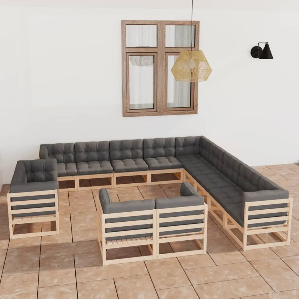 This 13-Piece Garden Lounge Set is made for turning your outdoor space into a chill zone for relaxing and hanging out. Its rustic charm comes from the warm tones of solid pinewood mixed with plush, weather-resistant cushions, making it perfect for lazy afternoons in your garden or on the balcony. Whether you’re having friends over or just enjoying some peace outside, this lounge set’s got comfort and style in spades, making it a standout piece in your outdoor decor. Modular Structure: The lounge set has a flexible design, allowing you to easily rearrange it to suit your needs and available space. Create your perfect outdoor layout for gatherings or peaceful chill-out time.Sturdily Constructed: Built from solid pinewood, this set is designed for durability, providing the strength you want in outdoor furniture. The natural wood finish looks great and fits right in with nature.Cushion Comfort: The seat cushions are made of weather-resistant material, keeping them soft and comfy while withstanding outdoor elements. With a zip for easy removal, cleaning the cushions is a breeze.Aesthetic Appeal: The rustic design showcases the beauty of natural materials, creating a cozy atmosphere in your garden or balcony. Perfect for any outdoor scenario, whether it’s a casual get-together or a formal gathering.Generous Seating Capacity: With space for 13 people, this lounge set is great for hosting family meet-ups or hanging out with friends. Enjoy entertaining in style without losing comfort.