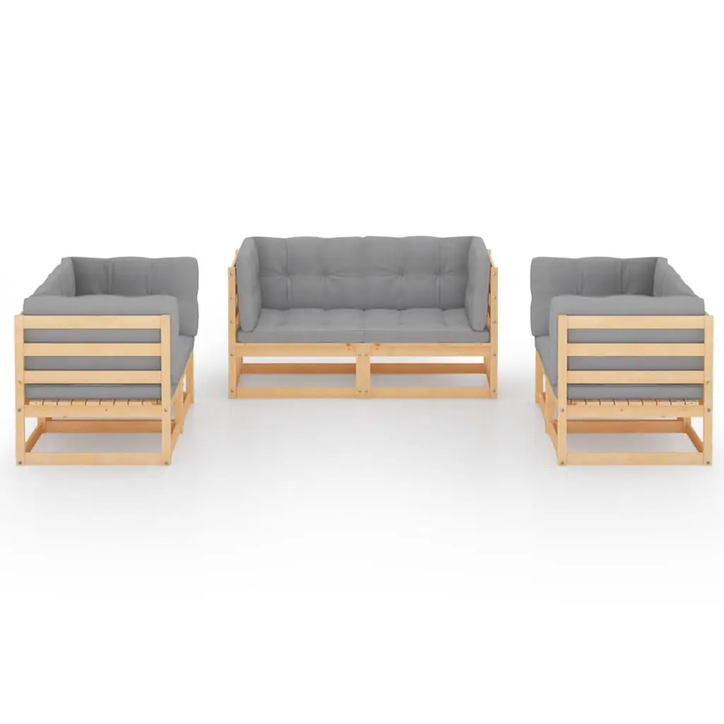 This 6-Piece Garden Lounge Set is a fantastic addition to your outdoor living space, giving you both comfort and style. Its modular design means you can set it up however you want, great for social gatherings or just relaxing on a sunny day. Modular Design: This sofa set can be easily rearranged to fit different layouts, seating up to six folks comfortably.Durable Materials: Built from solid pine wood, this lounge set is set to last, adding a natural flair to your garden.Cushions Included: Weather-resistant cushions provide top-notch comfort, making your outdoor lounging both easy and stylish.Easy to Maintain: With removable zippered covers, keeping the cushions clean is a piece of cake, so your lounge set always looks great.Elegant Design: The minimalist style fits in seamlessly with any outdoor decor, elevating the overall vibe of your patio or garden.