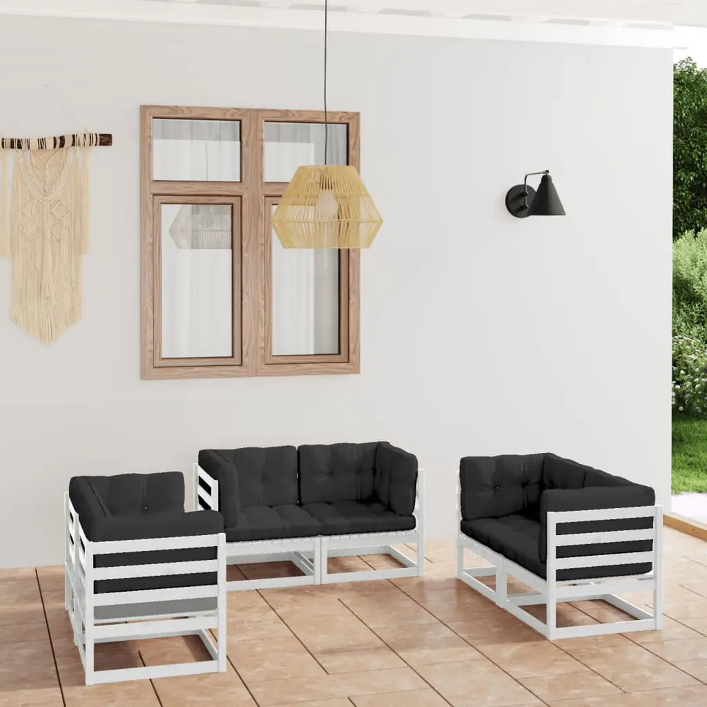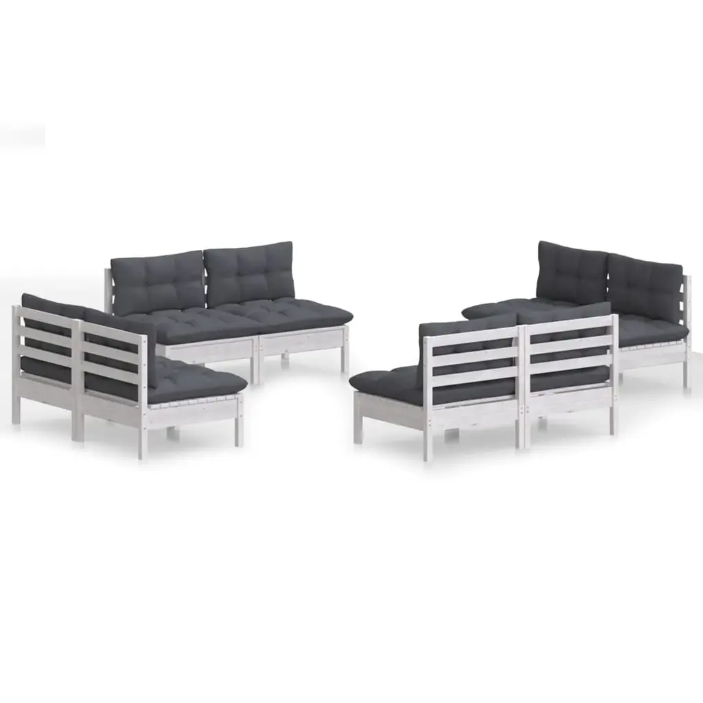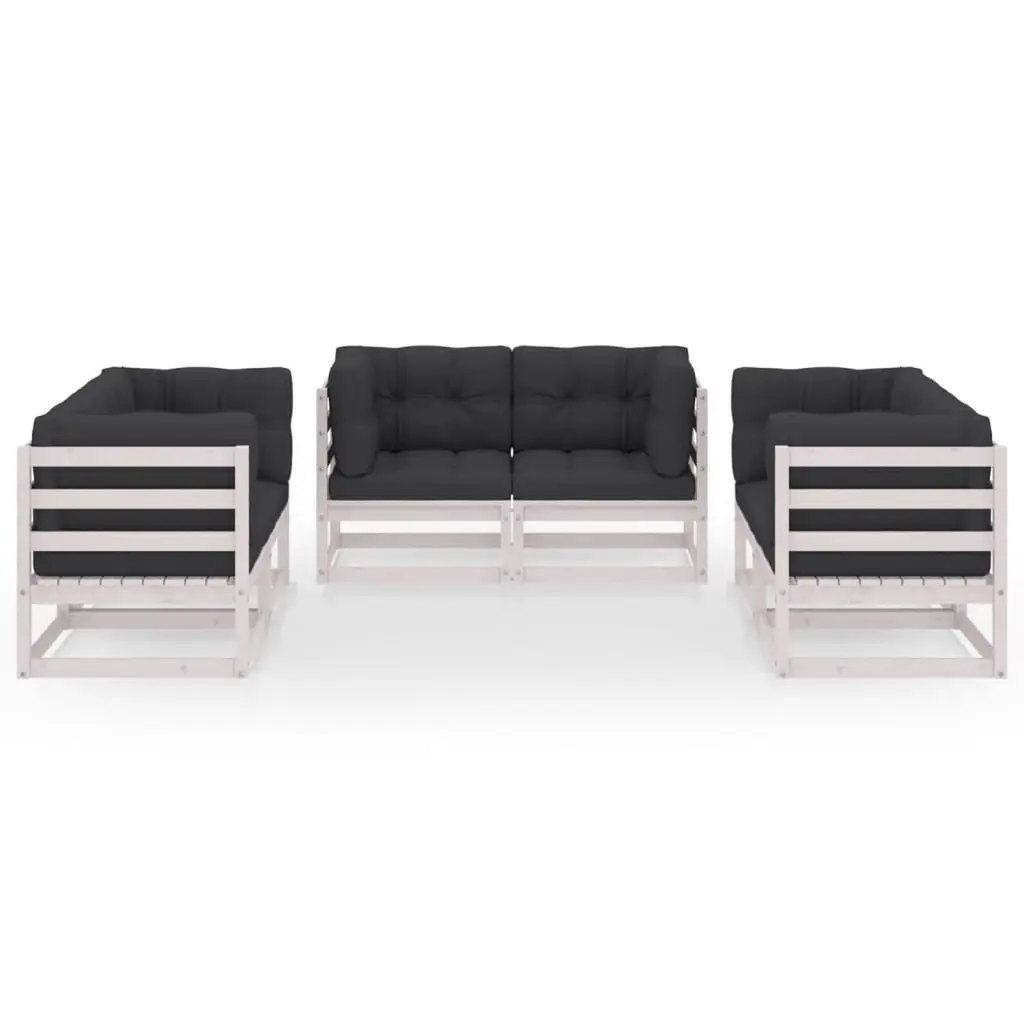 This Contemporary Garden Lounge Set gives you a stylish and inviting spot perfect for relaxing outdoors. It has a gorgeous design that fits nicely with garden terraces and balconies. With its solid pine frame coated in a sleek white finish and comfy cushions in a subtle anthracite color, this lounge set not only boosts the look of your space but also keeps it comfy for up to six guests, perfect for get-togethers or quiet nights stargazing. Superior Build Quality: Made of solid pine wood, this garden lounge set stands strong through different weather, ensuring long-lasting fun. The natural wood texture adds elegance, while the durable cushions keep everyone comfy during chats and gatherings. Thoughtful Design: Thanks to its modular setup, you can easily rearrange it to fit your space needs, letting you creatively use your outdoor area while keeping it all looking good. Soft and Supportive Cushions: Each seat and back cushion is plush with polyester fabric for a super comfy spot to relax. The removable, zippered covers make keeping it clean a breeze. Stylish Look: Pairing elegant white wood with rich anthracite cushions creates a chic look just right for any modern garden or terrace, making it a great backdrop for memorable times. Care Instructions: Follow simple care tips to keep your outdoor set looking great. Avoid direct sunlight and use covers when not in use to keep it pristine all year round.