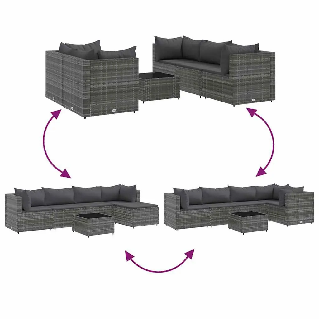 This 5 piece garden lounge set is a lovely blend of comfort and modern style, ideal for chilling outdoors with family or friends. The sleek grey poly rattan finish, along with soft cushions, creates a cozy vibe, perfect for patios, balconies, or gardens where relaxation is key. Spacious Seating: This patio lounge set comfortably fits up to five people, making it great for gatherings, BBQs, or sunny days out. Its roomy seating encourages laughter and conversation, inviting everyone to chill in comfort. Durable Construction: Made from a solid powder-coated steel frame and UV-resistant poly rattan, this lounge set is built to last and tough against the weather. You can relax knowing it'll hold up through all kinds of conditions. Adjustable Feet: With adjustable feet, you can easily level this set on uneven ground, giving you better stability and comfort wherever you set it down. It ensures a steady and enjoyable spot. Stylish Cushions: The set includes plush cushions with weather-resistant fabric, providing comfy seating while sprucing up the look of your outdoor space. Each cushion fits just right, so relaxing is both stylish and supportive. Easy Maintenance: With removable cushion covers that have zippers, cleaning is a snap, keeping them in great shape. Plus, the synthetic materials are easy to wipe down, ensuring a clean outdoor space with minimal fuss.