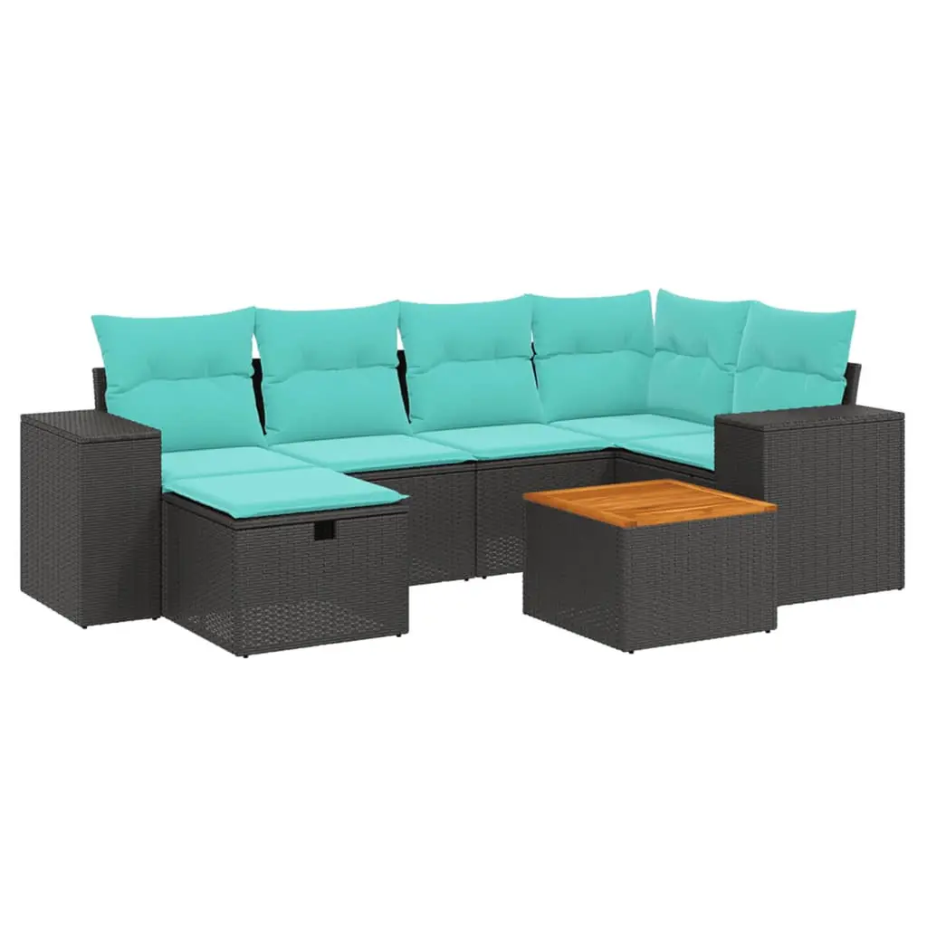 This 7 Piece Garden Lounge Set with Cushions is just what you need for kicking back and having fun with friends on your balcony or in the garden. It sports a modern design with clean lines and a mix of black Poly Rattan and tempered glass tops. Not only does it look fantastic, but its weather-resistant cushions ensure comfort is a given. Ideal for those who want both style and practicality in their outdoor area, this modular lounge set provides the flexibility needed for any outdoor space. Modular Design: The sectional layout lets you configure it to fit your space perfectly, making it great for family gatherings or just kicking back in the sun. Comfortable Cushions: Each seat has plush, removable cushions for top-notch support. Their waterproof fabric means they last longer and are easy to care for. Quality Materials: Made from UV-resistant PE Rattan, the lounge set holds up to various weather conditions without fading, keeping it looking fresh year after year. The powder-coated steel frame adds strength. Spacious Seating: Designed to comfortably fit up to six people, whether for a barbecue or a casual night outside, this set has plenty of space for all your guests while maintaining its stylish vibe. Easy Maintenance: The cushion covers unzip for easy cleaning, and the tempered glass top is simple to wipe down, keeping your lounge looking brand new.