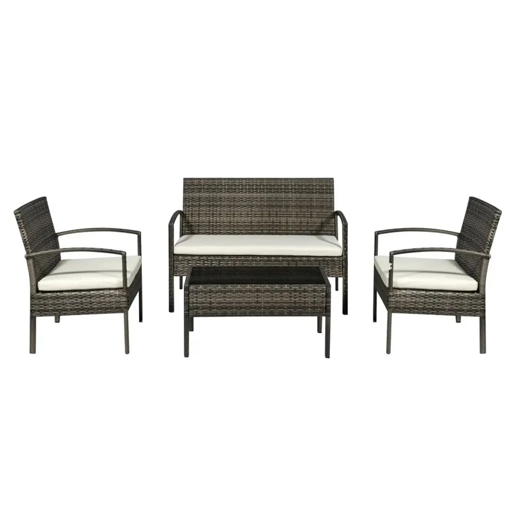 This 5-piece patio lounge set is cleverly designed to boost comfort and style in your outdoor space. With its striking brown poly rattan and soft white cushions, it offers visual appeal that turns balconies and gardens into inviting hangouts for socializing or chilling out alone. Cushion Comfort: The set comes with comfy, removable outdoor cushions made from weather-resistant fabric, ensuring durability and easy maintenance. Enjoy lazy afternoons sipping coffee while sinking into plush seating as the cushions provide just the right support.Stylish Design: With a contemporary vibe, the sleek woven texture of the poly rattan gives this lounge set a modern twist, making it a great fit for all sorts of patios, balconies, or gardens. Its elegant shapes invite relaxation and casual chats under sunshine.Durable Materials: Made from high-quality poly rattan, known for its toughness against UV rays and weather, this set means you can enjoy your outdoor furniture for years without worrying. Its robust construction holds up while still looking good over time.Versatile Use: Ideal for outdoor chilling, dining, or coffee serving, this set can switch between casual hangouts and peaceful evenings. Round up mates for dinner, or kick back with a book—the choices are endless.Perfect Size: The medium size fits nicely into various spaces. It handles up to 4 people comfortably, and includes a coffee table, chairs, and stools all designed to fit seamlessly into your outdoor lifestyle.