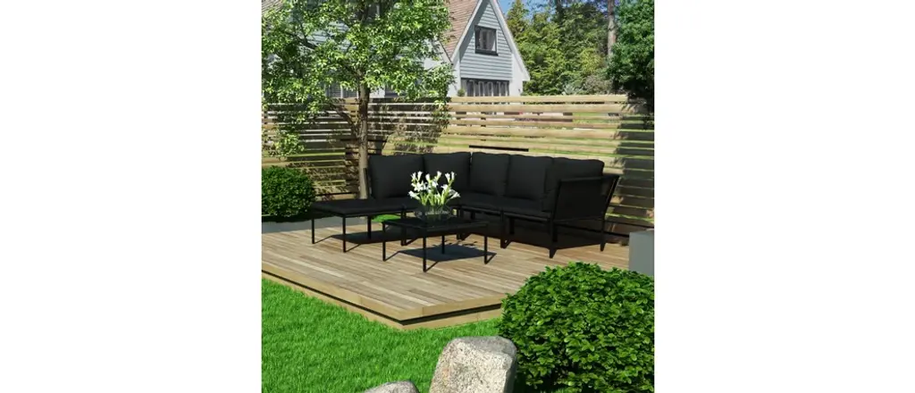 This patio lounge set combines style and functionality, and will become the focal point of your garden or patio. The whole furniture set is designed to be used outdoors year-round. Thanks to the sturdy powder-coated steel frame and weather-resistant PVC wire, the lounge set is is highly durable, hard-wearing and easy to clean. The removable cushions are thickly padded and soft, ensuring your utmost seating comfort. All sectional items are lightweight and modular, which makes it completely flexible and easy to move around to suit any setting. Assembly is required. Note: We recommend covering the set in the rain, snow and frost.Color: Black and anthraciteMaterial: PVC, powder-coated steel, fabric (100% polyester), tempered glassOverall dimensions: 74.8" x 78.7" x 25.6" (L x W x H)Corner sofa dimensions: 27.6" x 27.6" x 25.6" (L x W x H)Middle sofa dimensions: 23.6" x 27.6" x 25.6" (L x W x H)Footrest dimensions: 23.6" x 23.6" x 12.6" (L x W x H)Coffee table dimensions: 23.6" x 23.6" x 12.6" (L x W x H)Number of persons: 5With thickly padded cushionsWith wire designSturdy and durable constructionEasy to cleanLightweight and modularAssembly required: YesDelivery contains:2 x Corner sofa2 x Middle sofa1 x Footrest1 x Coffee table5 x Seat cushion6 x Back cushion