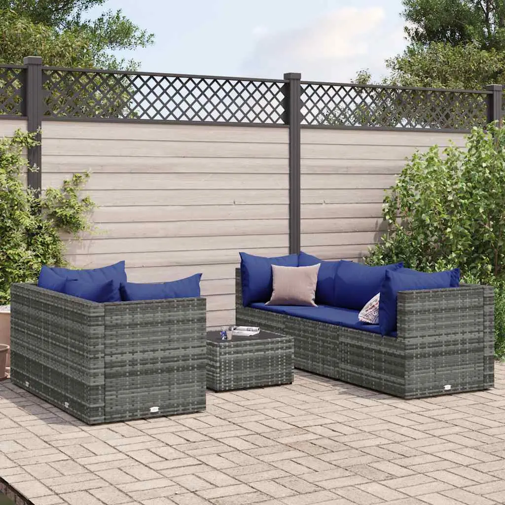 This Modern 6 Piece Patio Lounge Set is a smart mix of style and practicality, with a design that makes any patio or outdoor area stand out. The set features a roomy corner sofa and a matching coffee table, making it perfect for gatherings or romantic evenings under the stars, creating a relaxing vibe for you and your loved ones. Comfy Cushions: Each piece has removable cushions filled with foam and polyester for comfy sitting. This focus on comfort means you can relax all day without any hassle. Sturdy Build: With a frame made from powder-coated steel, this lounge set is stylish yet reliable. The metal frame combined with outdoor-grade rattan is weatherproof, ensuring the furniture stays strong even through bad weather. Spacious Seating: The set comfortably fits up to six people, making it great for family gatherings or entertaining guests. It turns your patio into a friendly space for fun or chilling. Easy Upkeep: The cushions have zippers for easy cleaning, and the rattan simply wipes down with a damp cloth, making maintenance a breeze so you can enjoy your outdoor time more. Customizable Setup: The modular design allows for lots of setups. You can shuffle the pieces around to fit your space or style needs, bringing both function and creativity to your outdoor layout.