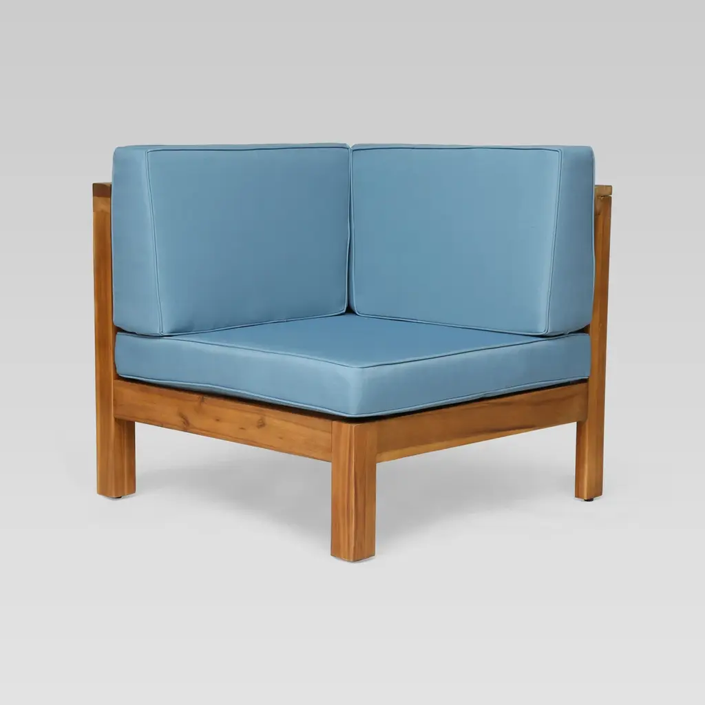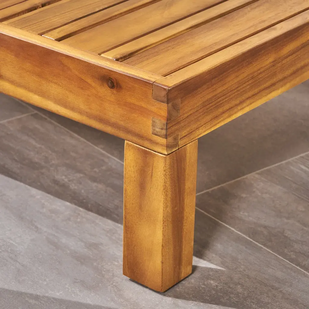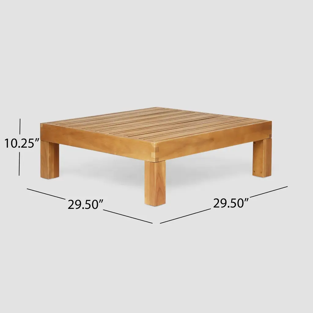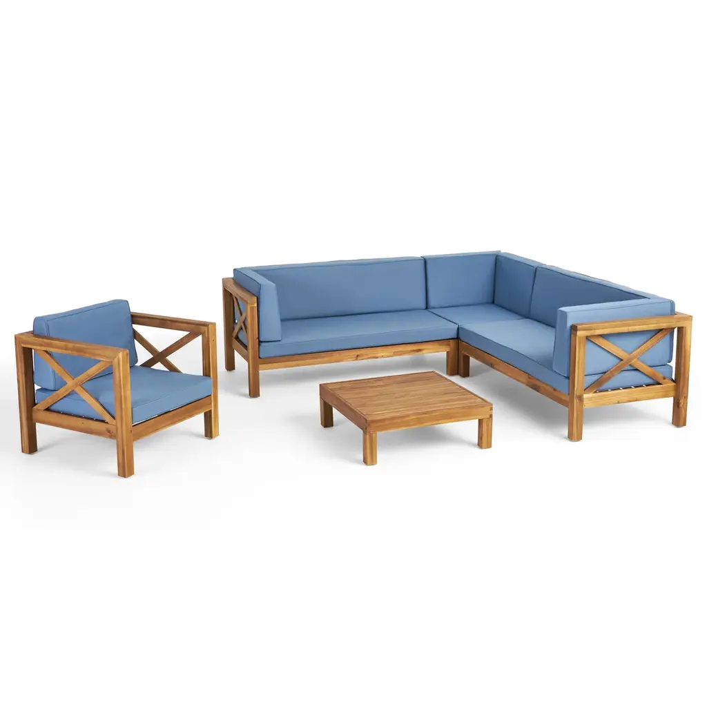 About This Product This outdoor seating group set instantly creates a classic look with solid wood construction. It includes one sectional sofa, one armchair, and one coffee table, all crafted from solid acacia wood in that signature warm honey-brown teak wood hue. The seating design features clean lines and X-shaped accents on the arms, and they both come with all the cushions you need for comfort and support. We love that the matching coffee table has a low profile to complete the streamlined look of this modern outdoor seating group.