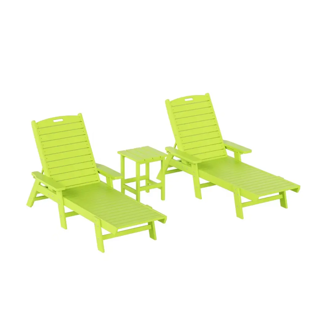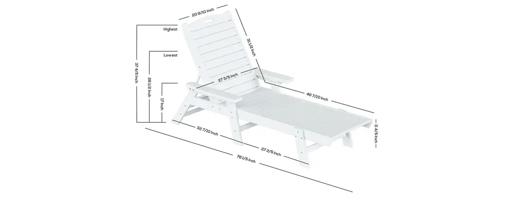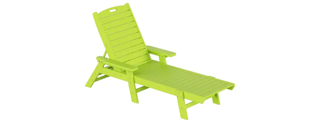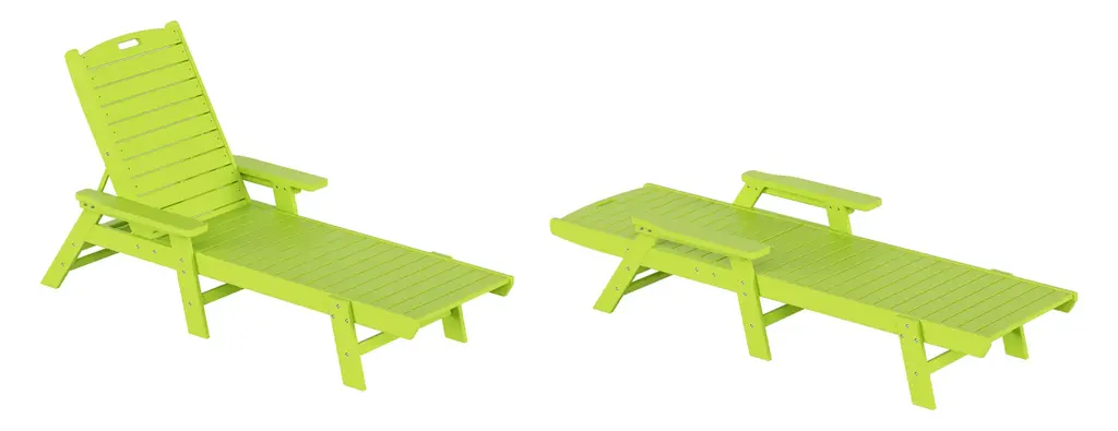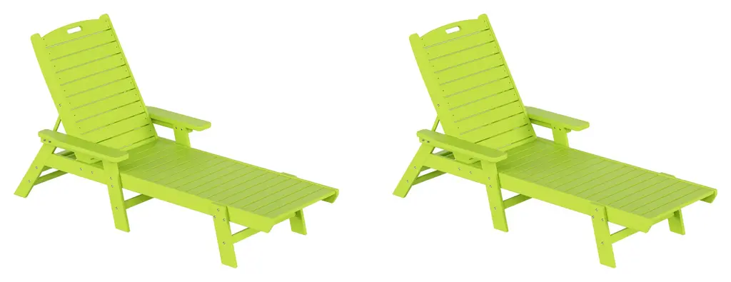 Whether you're on the top deck of a yacht or poolside in your backyard, the Adjustable Captain Chaise Lounge Chair with Arms is the best place to lay back and relax. Made with high-quality [HDPE] material, which increases durability and is resistant to UV radiation, water, and the elements of the outdoors. Get the most out of your chaise lounge chairs when lounging in the sun thanks to the reclinable design, which lets you place the chair in any position. The chairs can be folded flat, and the handle in the headrest makes it simple to move the chairs and store them away.FeaturesSet includes: two (2) reclining chaise lounge chairsBackrest can be adjusted in 5 different positions for the perfect seatDurable HDPE material ensures no peels, crack, chips, or rottingEasy to move thanks to the headrest's handleMade to withstand the harsh elements of the outdoors giving you the most out of the chairUV resistant protects from fading and weather resistant helps prevent mold or mildewDetailsProduct Type: Outdoor Chaise LoungesDimensions: 27.6" W x 78.2" D x 38" H