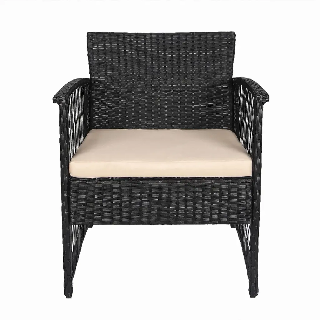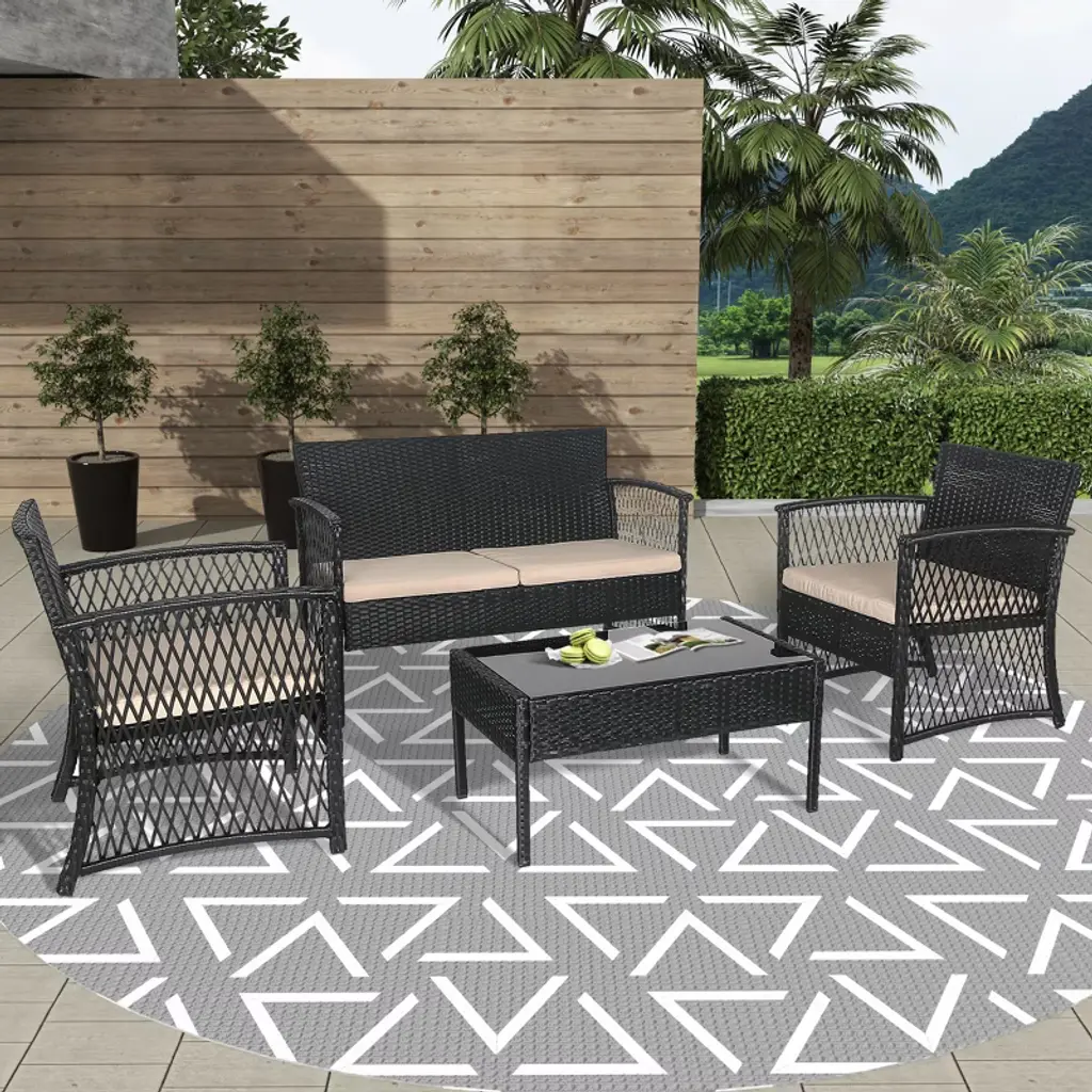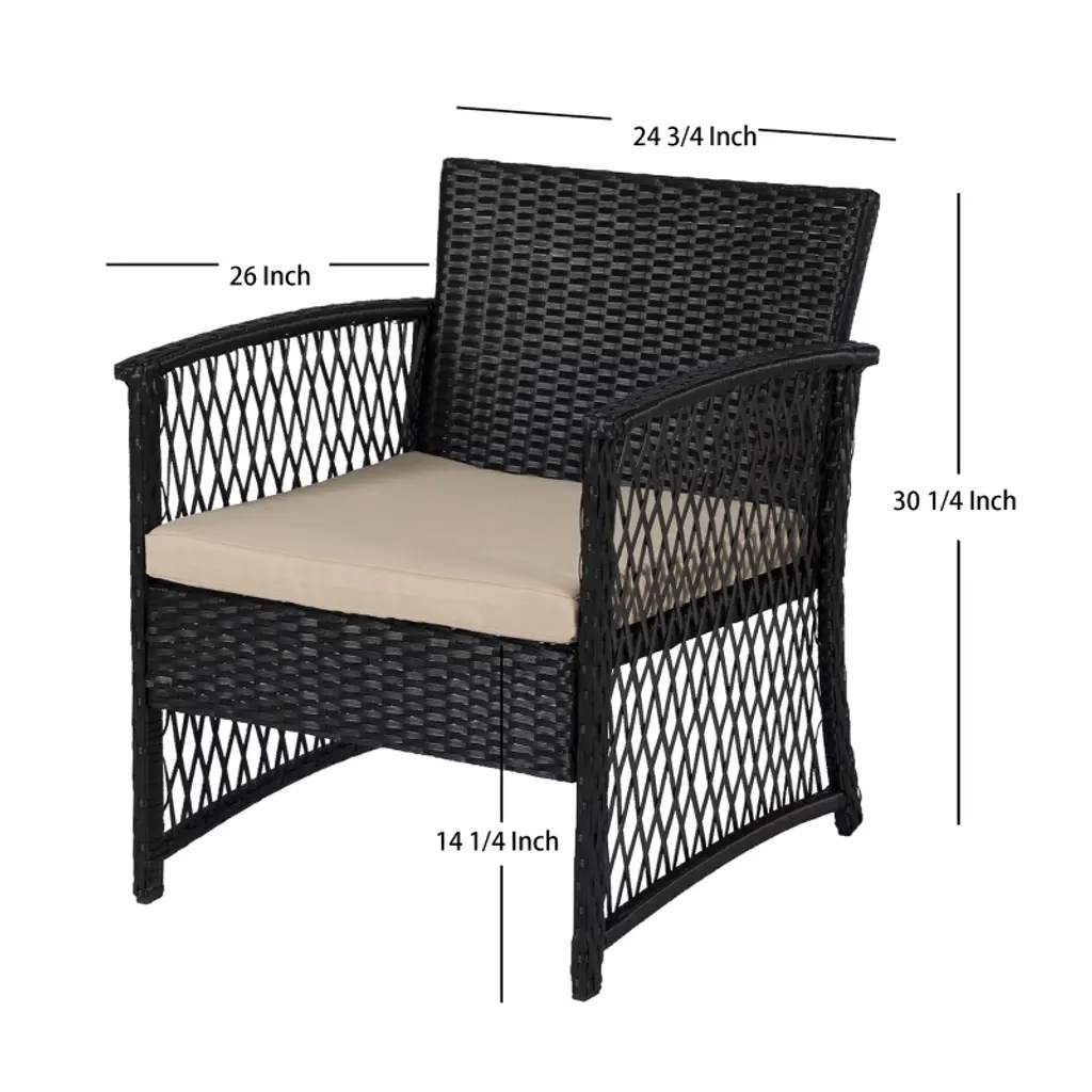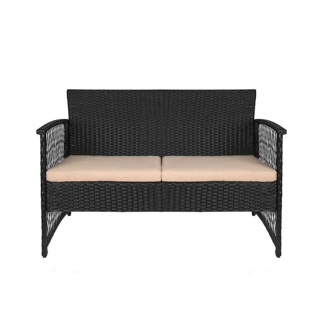 Turn your backyard into a place of style,comfort, and conversation space with this beautiful 4-piece woven rattan wicker and coffee table conversation set. The entire set is wrapped in a beautiful black woven rattan wicker that is made up of PE material that adds durability and strength to the set and with a UV and weather resistant coating that prevents fading and keeps the set in prime condition. The beige padded cushion covers are made of a polyester blend that is both an all-weather fabric and fade resistant, so they keep your furniture looking good all year long. This is the perfect set to make your backyard the place to be.While we strive to accurately represent product colors, please be aware that actual colors may vary slightly due to individual screen settings and lighting conditions. FeaturesSet includes: One (1) sofa loveseat, Two (2) arm chairs, and One (1) coffee tableDurable PE resin rattan wickerFade resistant polyester cushionsDurable steel frame supports up to 250lbs. per seatUV and weather resistant rattan wickerSimple and easy to assembleDetails:Product Type: Patio Conversation SetsWhat's Included: (2) Chair; (1) Loveseat; (1) TableChairDimensions: 24.75" W x 26" D x 30.25" HLoveseatDimensions: 44.5" W x 26" D x 30.25" HWeight: 71 lbs.Weight Capacity: 600 lbs.TableDimensions: 31" W x 18" D x 15" HWeight Capacity: 66 lbs.