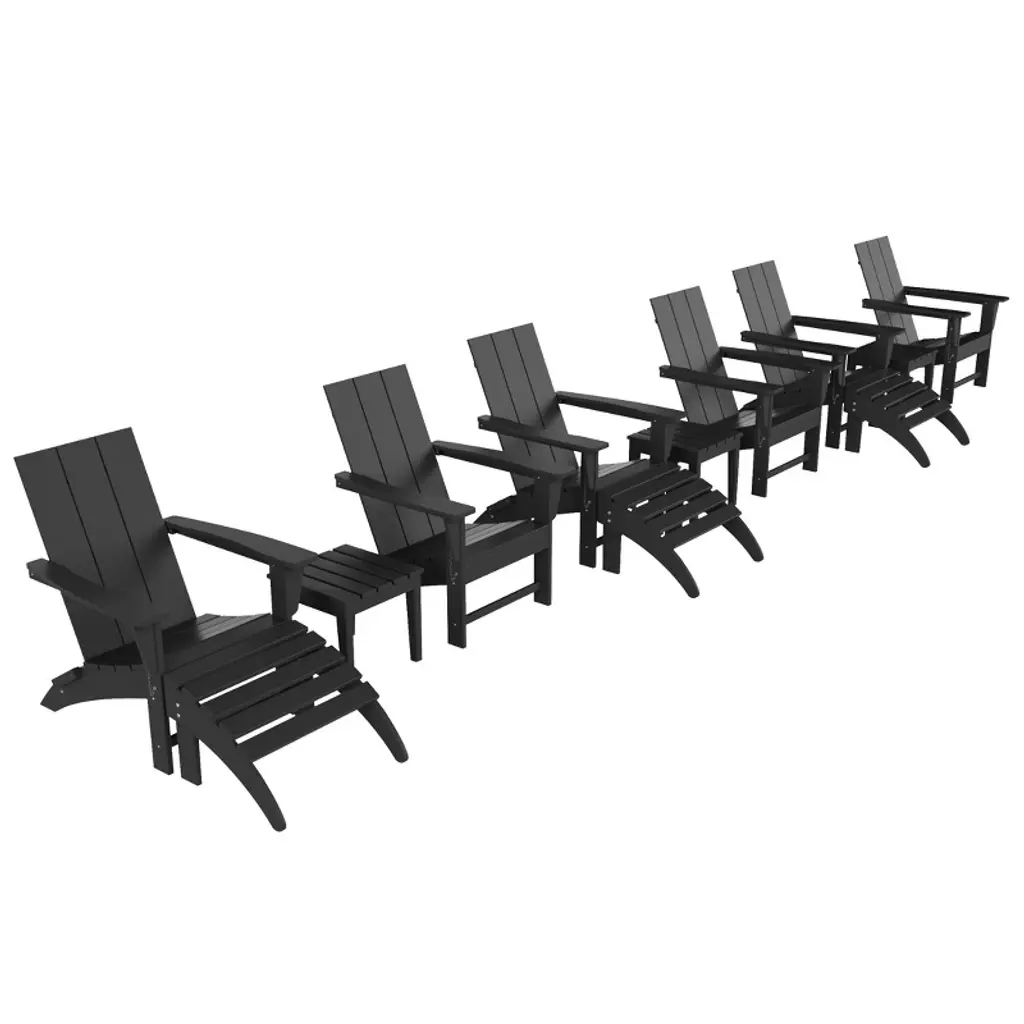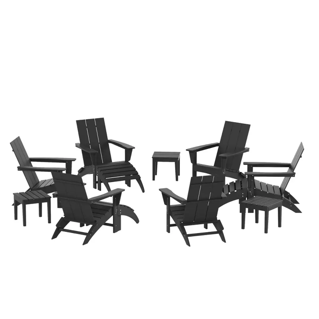 Get together with friends and family this season with this beautiful 12-piece patio set. Each piece is crafted with eco-friendly HDPE lumber that is both perfect for the environment and durable. Perfect for the outdoors with a UV and weather-resistant material that helps protect the set from harsh outdoor elements like the sun, snow, and rain. Kick your feet up and relax with the foldable ottomans and place your drink on the side table. Sit and relax in comfort with the wide seat and armrest and the slight contoured seat. Put the chairs away with ease with the foldable design to make more space whenever needed.While we strive to accurately represent product colors, please be aware that actual colors may vary slightly due to individual screen settings and lighting conditions. FeaturesSet Includes: Six (6) Adirondack Chairs, Three (3) Side Tables, Three (3) Foldable OttomansMade with Eco-friendly HDPE plasticWeather and UV resistantance protects from the harsh outdoor weatherFade resistant colors to keep that vibrant colorPremium materials prevent cracks, chips, or peelingFoldable ottoman and chairs for easy storage and move aroundRust resistant stainless steel hardwareDetails:Product Type: Patio Conversation SetsWhat's Included: (6) Adirondack Chair; (3) Ottoman; (3) Side TableAdirondack ChairDimensions: 30" W x 32" D x 35.5" HWeight: 39.25 lbs.Seat Width: 20.5"Seat Depth: 20"Seat Height: 15"Weight Capacity: 450 lbs.OttomanDimensions: 20" W x 13.5" D x 18.75" HWeight: 8.75 lbs.Table Top Thickness: 0.5"Seat Width: 20.5"Seat Depth: 20"Side TableDimensions: 17.75" W x 17.75" D x 17" HWeight: 15.75 lbs.Table Top Thickness: 0.5"Weight Capacity: 110 lbs.