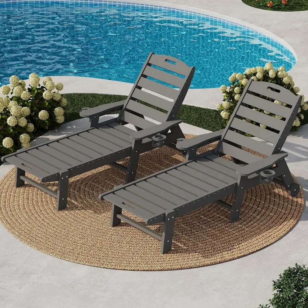 Lounge back and relax this summer with a friend or loved one with our charming Chaise Lounger with Arms and Wheels and side table. Relax by the pool this season in style with the modern Adirondack backrest that is easy to adjust, so you can sit up, lay your arms on the armrest and read a book, or lay back and catch a tan, while having your drink right by your side with our matching 18" side table. Each piece is made with a durable, eco-friendly HDPE material that is resistant to the harsh UV rays and has fade-resistant coloring, so you can keep your lounger looking great all season. If you need to move the lounger from storage or just need some more shade, simply pick up the lounger from the front and move to wherever you need with the helpful wheels that make moving it an ease. This lounger is sure to make your summer more relaxing and comfortable.While we strive to accurately represent product colors, please be aware that actual colors may vary slightly due to individual screen settings and lighting conditions. FeaturesSet Includes: Two (2) Chaise Loungers with arms and wheels and One (1) 18" Square Side TableEco-friendly HDPE materialAdjustable backrest for multiple lounging positionsSpacious armrest for all-day comfortWheels on back legs to move around or store with easeUV and Fade resistant protect color and material from harsh sunSimple to assembleDetails:Product Type: Patio Chaise LoungesWhat's Included: (2) Chaise Lounge; (1) Side TableChaise LoungeDimensions: 21" W x 75.5" D x 37.75" HWeight: 70 lbs.Seat Width: 21"Seat Depth: 44"Seat Height: 12.25"Weight Capacity: 330 lbs.Table Top Thickness: 0.5"Seat Width: 21"Seat Depth: 44"Side TableDimensions: 17.75" W x 17.75" D x 17" HWeight: 15.75 lbs.Table Top Thickness: 0.5"Weight Capacity: 110 lbs.