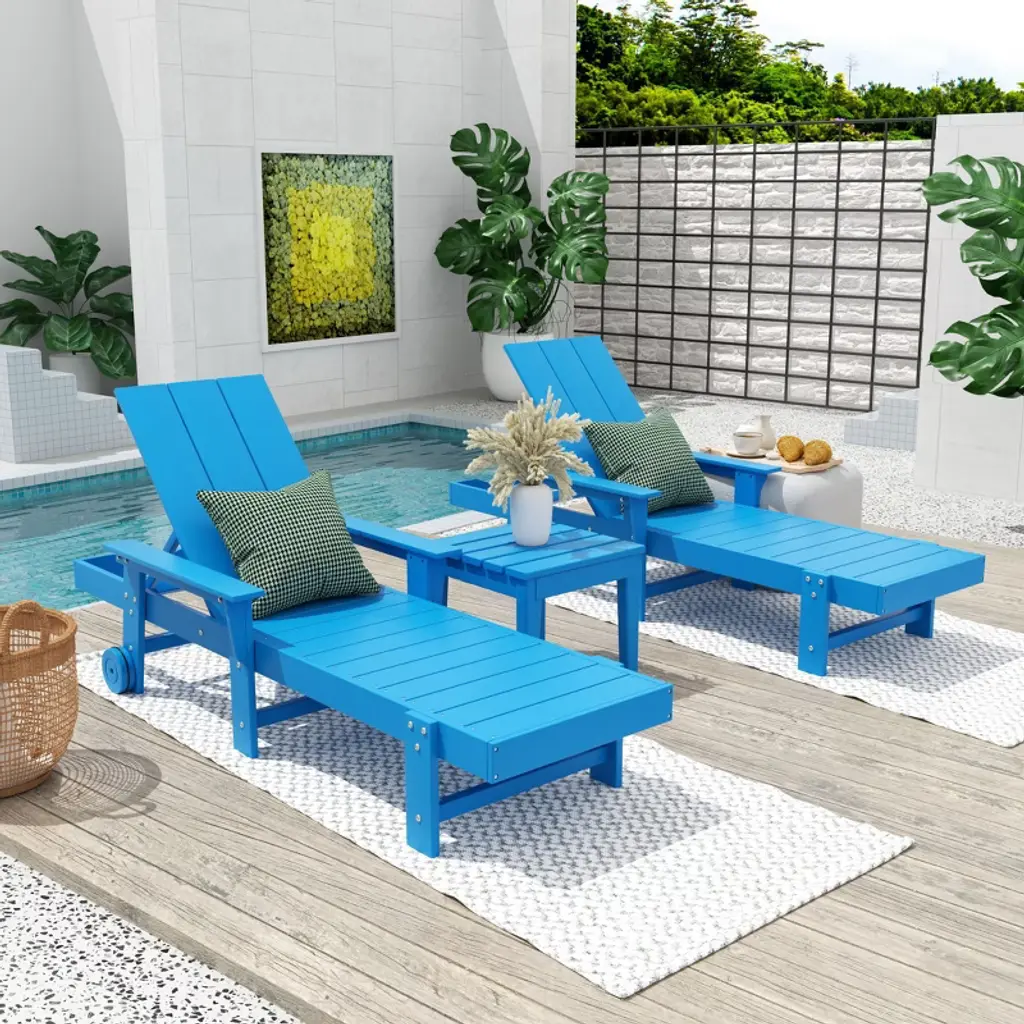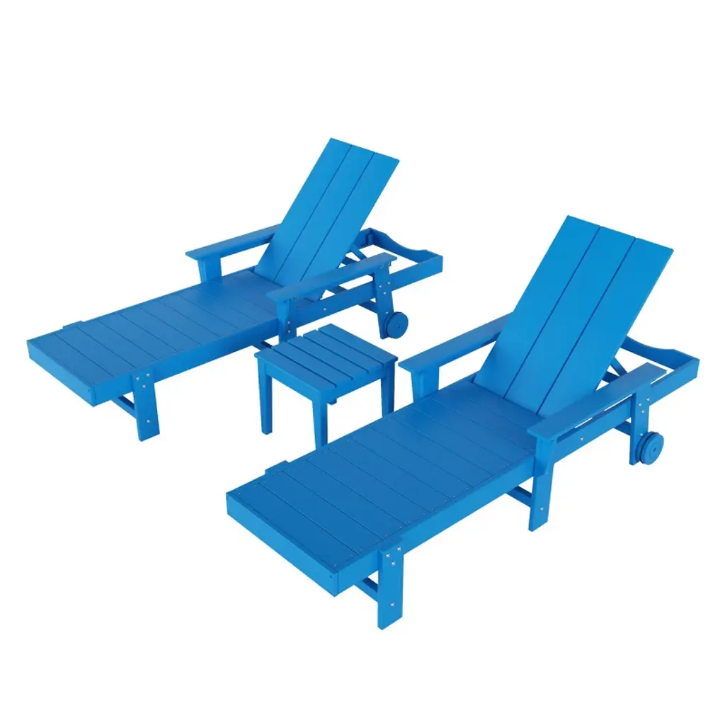 Lounge back and relax this summer with a friend or loved one with our charming Chaise Lounger with Arms and Wheels and side table. Relax by the pool this season in style with the modern Adirondack backrest that is easy to adjust, so you can sit up, lay your arms on the armrest and read a book, or lay back and catch a tan, while having your drink right by your side with our matching 18" side table. Each piece is made with a durable, eco-friendly HDPE material that is resistant to the harsh UV rays and has fade-resistant coloring, so you can keep your lounger looking great all season. If you need to move the lounger from storage or just need some more shade, simply pick up the lounger from the front and move to wherever you need with the helpful wheels that make moving it an ease. This lounger is sure to make your summer more relaxing and comfortable.While we strive to accurately represent product colors, please be aware that actual colors may vary slightly due to individual screen settings and lighting conditions. FeaturesSet Includes: Two (2) Chaise Loungers with arms and wheels and One (1) 18" Square Side TableEco-friendly HDPE materialAdjustable backrest for multiple lounging positionsSpacious armrest for all-day comfortWheels on back legs to move around or store with easeUV and Fade resistant protect color and material from harsh sunSimple to assembleDetails:Product Type: Patio Chaise LoungesWhat's Included: (2) Chaise Lounge; (1) Side TableChaise LoungeDimensions: 21" W x 75.5" D x 37.75" HWeight: 70 lbs.Seat Width: 21"Seat Depth: 44"Seat Height: 12.25"Weight Capacity: 330 lbs.Table Top Thickness: 0.5"Seat Width: 21"Seat Depth: 44"Side TableDimensions: 17.75" W x 17.75" D x 17" HWeight: 15.75 lbs.Table Top Thickness: 0.5"Weight Capacity: 110 lbs.