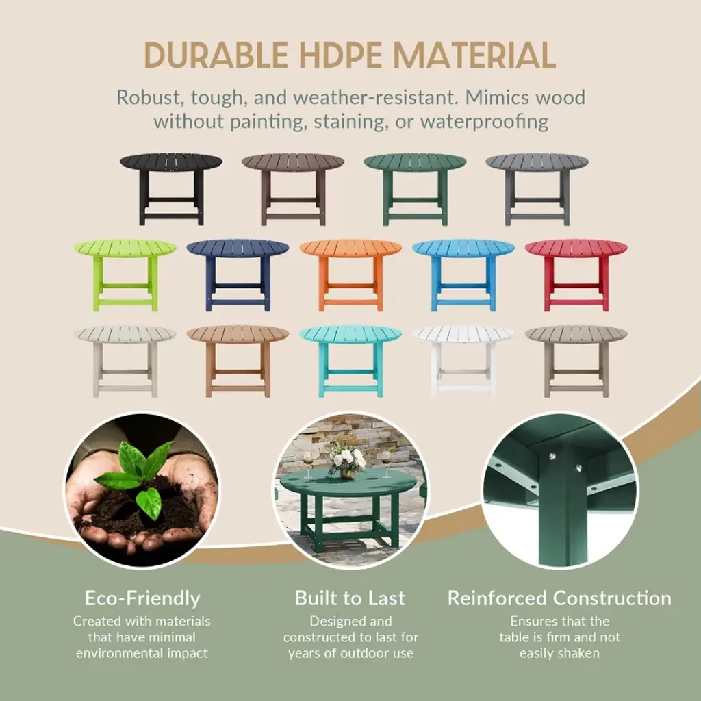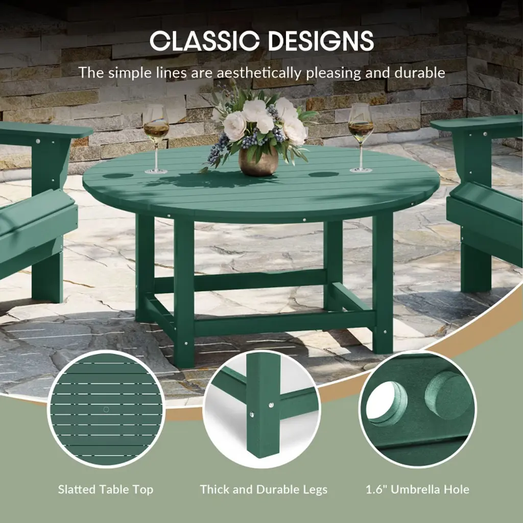 Gather around with your loved ones around our charming 5-piece Adirondack conversation set. Crafted with a durable HDPE all-weather material that is perfect for the outdoors with its resistance to UV and fading. Comfortable chairs with spacious armrest and deep reclined seats to help relieve tension on your lower half and combined with the wide 38" round coffee table that provides plenty of space for all your drinks and a center umbrella hole that can fit 1.5" umbrella poles for added shade.While we strive to accurately represent product colors, please be aware that actual colors may vary slightly due to individual screen settings and lighting conditions. FeaturesSet Includes: Four (4) Adirondack Chairs, One (1) 38" Round Coffee TableConstructed from Durable HDPE Material and Designed to be Stable and SturdyWeather Resistant to Protect Against the Harsh Outdoor Elements and Fade and UV Resistant to Protect Against the Sun38" Inch Wide Table Top Fitted with a 1.5" Center Umbrella Hole to that Fits Most Standard Umbrellas (Umbrella Sold Seperately;Hole Cover Included)4.5" Wide Armrest and Deep Reclined Seat for Tension Relief on your Lower HalfReinforced Table Top Design for Added Durability and Thick Legs with Beam Connection for Added StabilitySmooth and Rounded Edges for Added Protection Against Scratches or BruisesDetails:Product Type: Patio Conversation SetsWhat's Included: (4) Adirondack Chair; (1) Coffee TableAdirondack ChairDimensions: 31.75" W x 33.5" D x 36.5" HWeight: 42 lbs.Seat Width: 22"Seat Depth: 20"Seat Height: 15"Weight Capacity: 450 lbs.Coffee TableDimensions: 37.75" W x 37.75" D x 17.5" HWeight: 40.5 lbs.