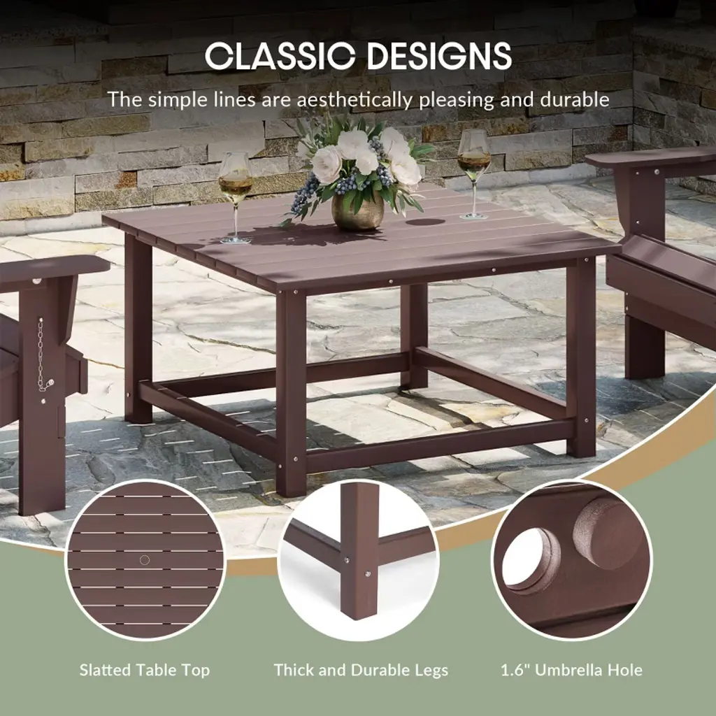 Gather around with your loved ones around our charming 5-piece Adirondack conversation set. Crafted with a durable HDPE all-weather material that is perfect for the outdoors with its resistance to UV and fading. Comfortable chairs with spacious armrest and deep reclined seats to help relieve tension on your lower half and combined with the wide 30" square coffee table that provides plenty of space for all your drinks and a center umbrella hole that can fit 1.5" umbrella poles for added shade.While we strive to accurately represent product colors, please be aware that actual colors may vary slightly due to individual screen settings and lighting conditions. FeaturesSet Includes: Four (4) Adirondack Chairs, One (1) 30" Square Coffee TableConstructed from Durable HDPE Material and Designed to be Stable and SturdyWeather Resistant to Protect Against the Harsh Outdoor Elements and Fade and UV Resistant to Protect Against the Sun30" Inch Wide Table Top Fitted with a 1.5" Center Umbrella Hole to that Fits Most Standard Umbrellas (Umbrella Sold Seperately;Hole Cover Included)4.5" Wide Armrest and Deep Reclined Seat for Tension Relief on your Lower HalfReinforced Table Top Design for Added Durability and Thick Legs with Beam Connection for Added StabilitySmooth and Rounded Edges for Added Protection Against Scratches or BruisesDetails:Product Type: Patio Conversation SetsWhat's Included: (4) Adirondack Chair; (1) Coffee TableAdirondack ChairDimensions: 31.75" W x 33.5" D x 36.5" HWeight: 42 lbs.Seat Width: 22"Seat Depth: 20"Seat Height: 15"Weight Capacity: 450 lbs.Coffee TableDimensions: 30.75" W x 30.75" D x 17.5" HWeight: 35.25 lbs.Weight Capacity: 300 lbs.