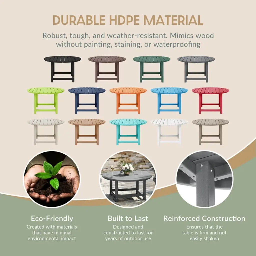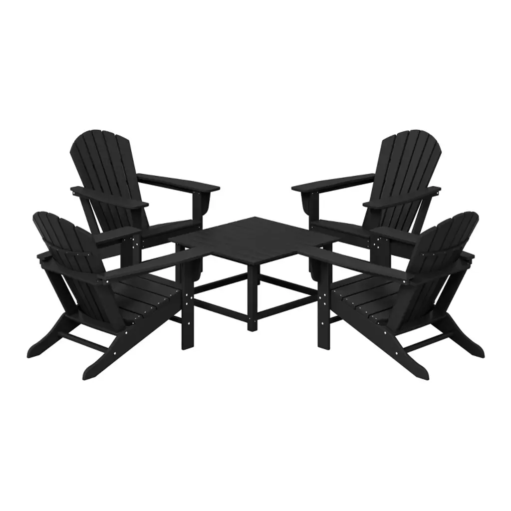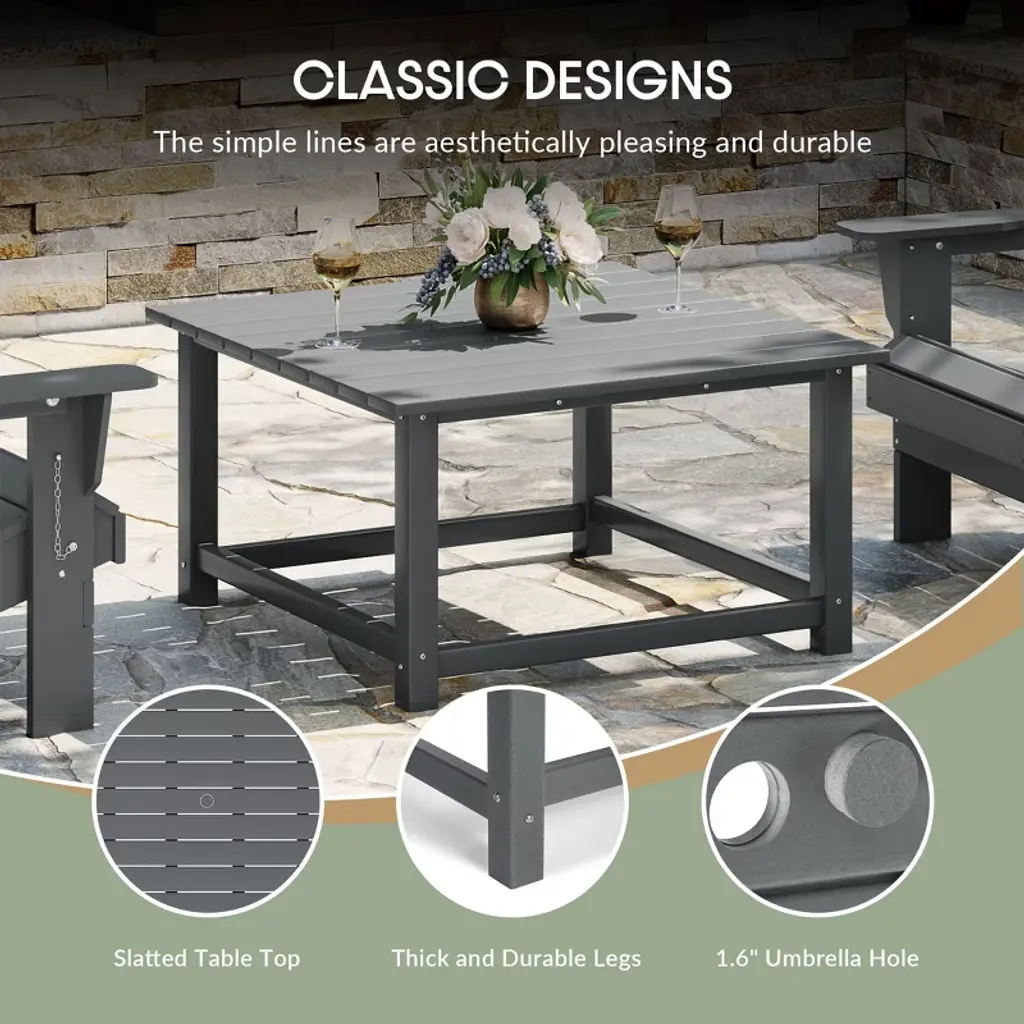 Gather around with your loved ones around our charming 5-piece Adirondack conversation set. Crafted with a durable HDPE all-weather material that is perfect for the outdoors with its resistance to UV and fading. Comfortable chairs with spacious armrest and deep reclined seats to help relieve tension on your lower half and combined with the wide 30" square coffee table that provides plenty of space for all your drinks and a center umbrella hole that can fit 1.5" umbrella poles for added shade.While we strive to accurately represent product colors, please be aware that actual colors may vary slightly due to individual screen settings and lighting conditions. FeaturesSet Includes: Four (4) Adirondack Chairs, One (1) 30" Square Coffee TableConstructed from Durable HDPE Material and Designed to be Stable and SturdyWeather Resistant to Protect Against the Harsh Outdoor Elements and Fade and UV Resistant to Protect Against the Sun30" Inch Wide Table Top Fitted with a 1.5" Center Umbrella Hole to that Fits Most Standard Umbrellas (Umbrella Sold Seperately;Hole Cover Included)4.5" Wide Armrest and Deep Reclined Seat for Tension Relief on your Lower HalfReinforced Table Top Design for Added Durability and Thick Legs with Beam Connection for Added StabilitySmooth and Rounded Edges for Added Protection Against Scratches or BruisesDetails:Product Type: Patio Conversation SetsWhat's Included: (4) Adirondack Chair; (1) Coffee TableAdirondack ChairDimensions: 31.75" W x 33.5" D x 36.5" HWeight: 42 lbs.Seat Width: 22"Seat Depth: 20"Seat Height: 15"Weight Capacity: 450 lbs.Coffee TableDimensions: 30.75" W x 30.75" D x 17.5" HWeight: 35.25 lbs.Weight Capacity: 300 lbs.
