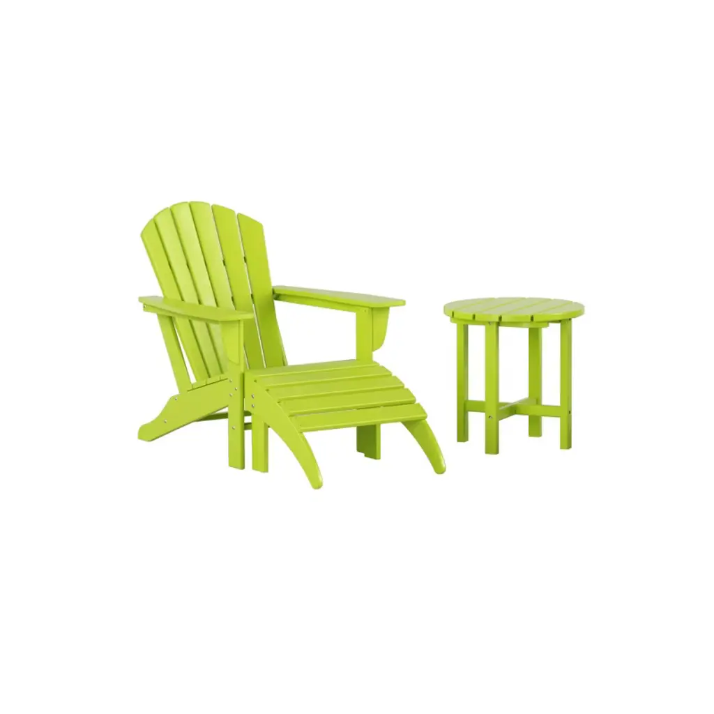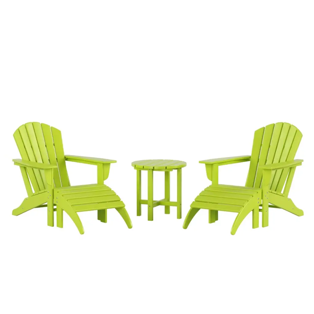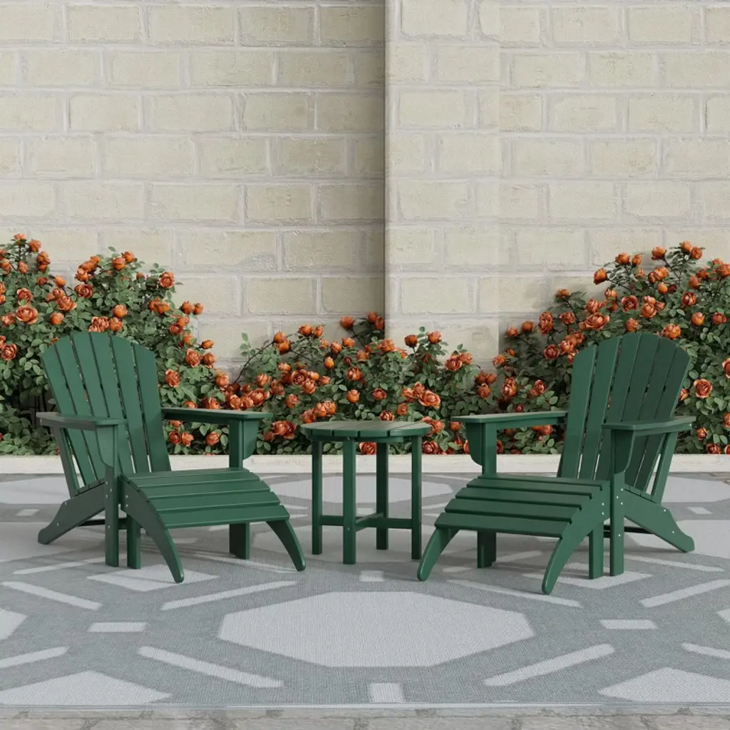 Sit back, relax, and catch a tan or enjoy some family time on these stunningly crafted 5-piece Adirondack chairs with ottoman set. Designed with comfort and style in mind, with a broad armrest for extra armroom, a seashell design and curved reclined backrest for a more comfortable seat, and a high back that helps create less tension on your back. Constructed from a durable and solid HDPE material that is weather resistant and, unlike wood, won't rot, crack, chip, peel, or splinter. A UV-protective coating prevents fading, keeping the colors vibrant and amazing all year long. These attractive chairs are easy to clean, making them perfect for the outdoors, and they are sure to make your backyard the place to be.While we strive to accurately represent product colors, please be aware that actual colors may vary slightly due to individual screen settings and lighting conditions. FeaturesSet includes two (2) Adirondack chairs with two (2) ottomans and one (1) side tablestain-resistant in case of any accidentsWeather-resistant material safeguards against the elements and UV ray coating stops color fadingSturdy construction that is long-lasting and resistant to chipping, flaking, or splintersSimple to clean with just soap, water, and a soft brushVariety of lovely fade-resistant colorsMade of weather-resistant material that can survive the outdoor elementsDetails:Product Type: Patio Conversation SetsWhat's Included: (2) Adirondack Chair; (2) Ottoman; (1) Side TableAdirondack ChairDimensions: 31.75" W x 33.5" D x 36.5" HWeight: 42 lbs.Seat Width: 22"Seat Depth: 20"Seat Height: 15"Weight Capacity: 450 lbs.OttomanDimensions: 20" W x 13.5" D x 18.75" HWeight: 8.75 lbs.Seat Width: 22"Seat Depth: 20"Side TableDimensions: 17.5" W x 17.5" D x 18" HWeight: 10.5 lbs.Weight Capacity: 180 lbs.