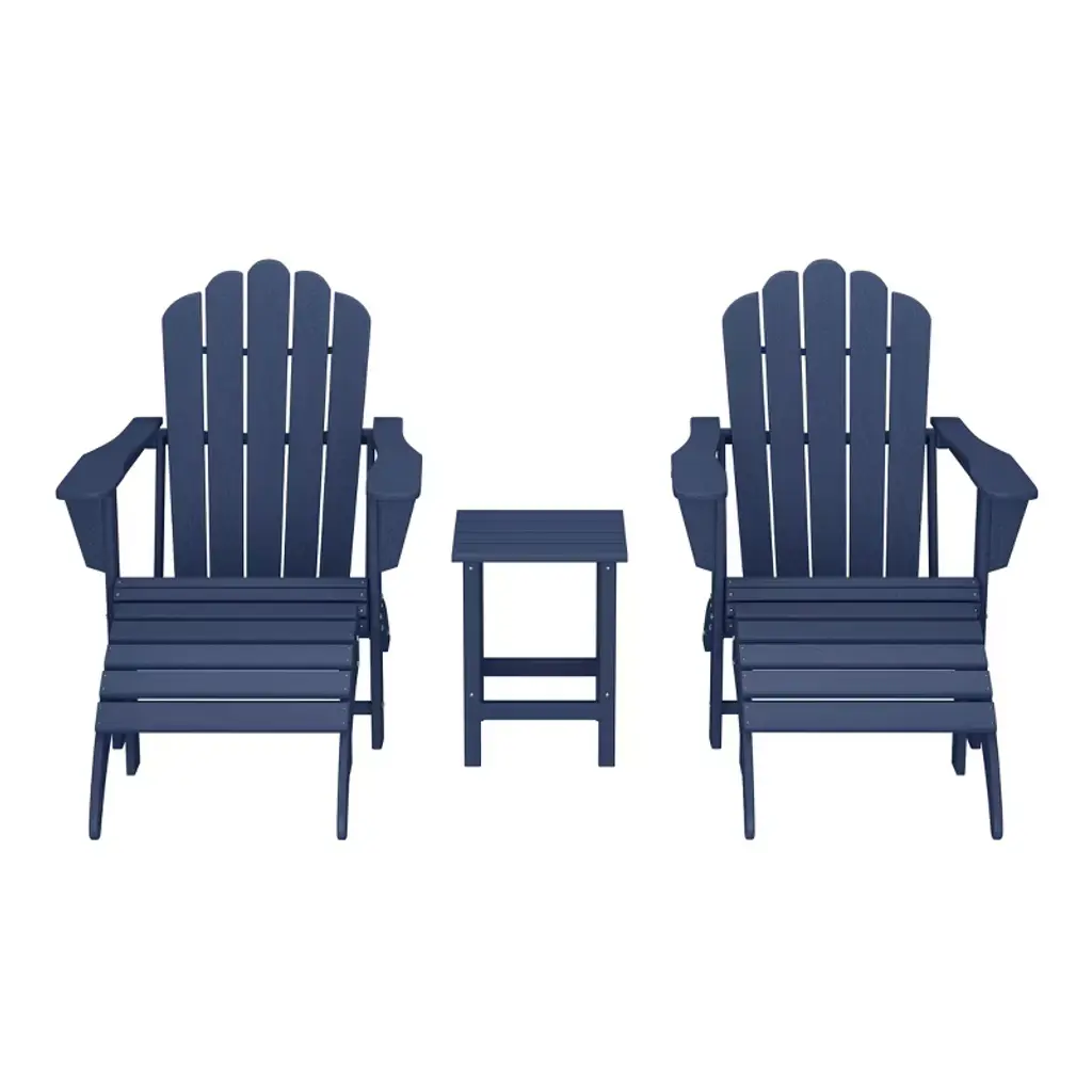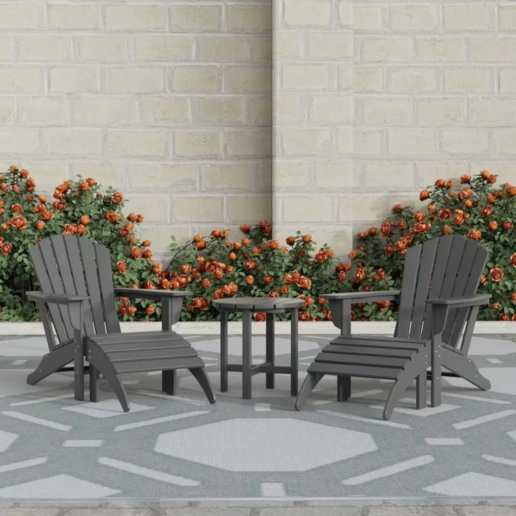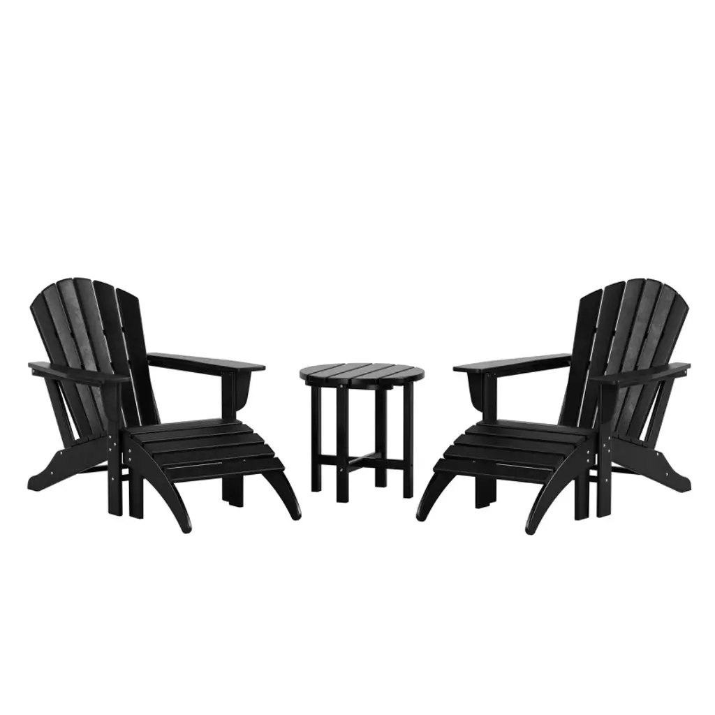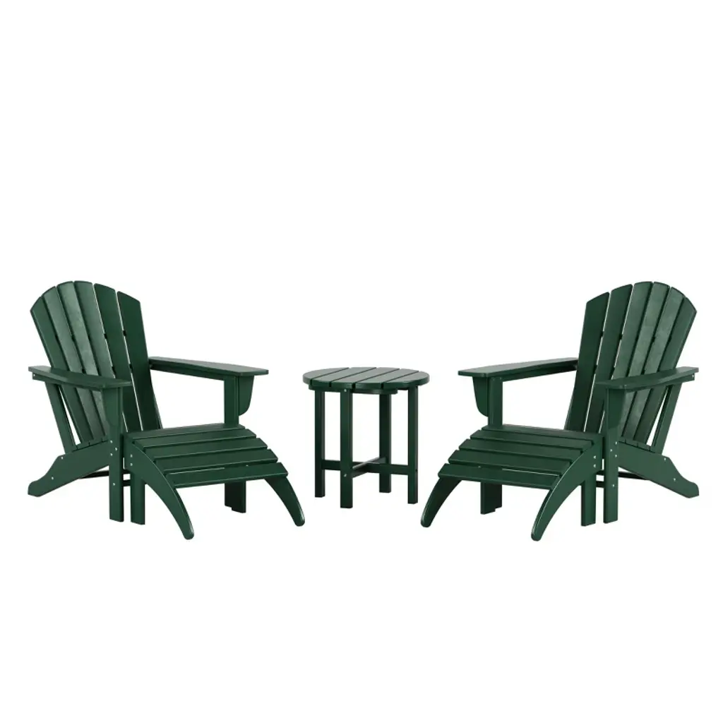 Sit back, relax, and catch a tan or enjoy some family time on these stunningly crafted 5-piece Adirondack chairs with ottoman set. Designed with comfort and style in mind, with a broad armrest for extra armroom, a seashell design and curved reclined backrest for a more comfortable seat, and a high back that helps create less tension on your back. Constructed from a durable and solid HDPE material that is weather resistant and, unlike wood, won't rot, crack, chip, peel, or splinter. A UV-protective coating prevents fading, keeping the colors vibrant and amazing all year long. These attractive chairs are easy to clean, making them perfect for the outdoors, and they are sure to make your backyard the place to be.While we strive to accurately represent product colors, please be aware that actual colors may vary slightly due to individual screen settings and lighting conditions. FeaturesSet includes two (2) Adirondack chairs with two (2) ottomans and one (1) side tablestain-resistant in case of any accidentsWeather-resistant material safeguards against the elements and UV ray coating stops color fadingSturdy construction that is long-lasting and resistant to chipping, flaking, or splintersSimple to clean with just soap, water, and a soft brushVariety of lovely fade-resistant colorsMade of weather-resistant material that can survive the outdoor elementsDetails:Product Type: Patio Conversation SetsWhat's Included: (2) Adirondack Chair; (2) Ottoman; (1) Side TableAdirondack ChairDimensions: 31.75" W x 33.5" D x 36.5" HWeight: 42 lbs.Seat Width: 22"Seat Depth: 20"Seat Height: 15"Weight Capacity: 450 lbs.OttomanDimensions: 20" W x 13.5" D x 18.75" HWeight: 8.75 lbs.Seat Width: 22"Seat Depth: 20"Side TableDimensions: 17.5" W x 17.5" D x 18" HWeight: 10.5 lbs.Weight Capacity: 180 lbs.