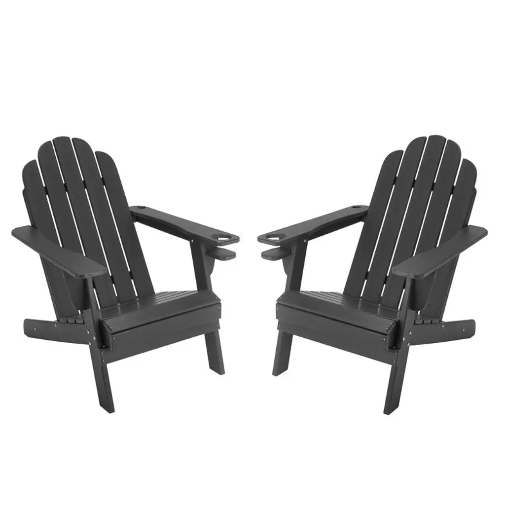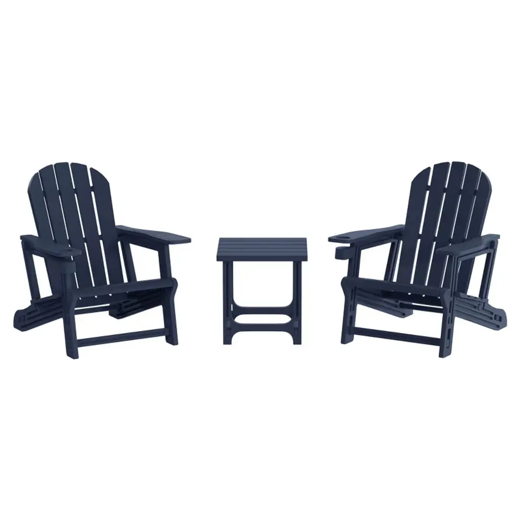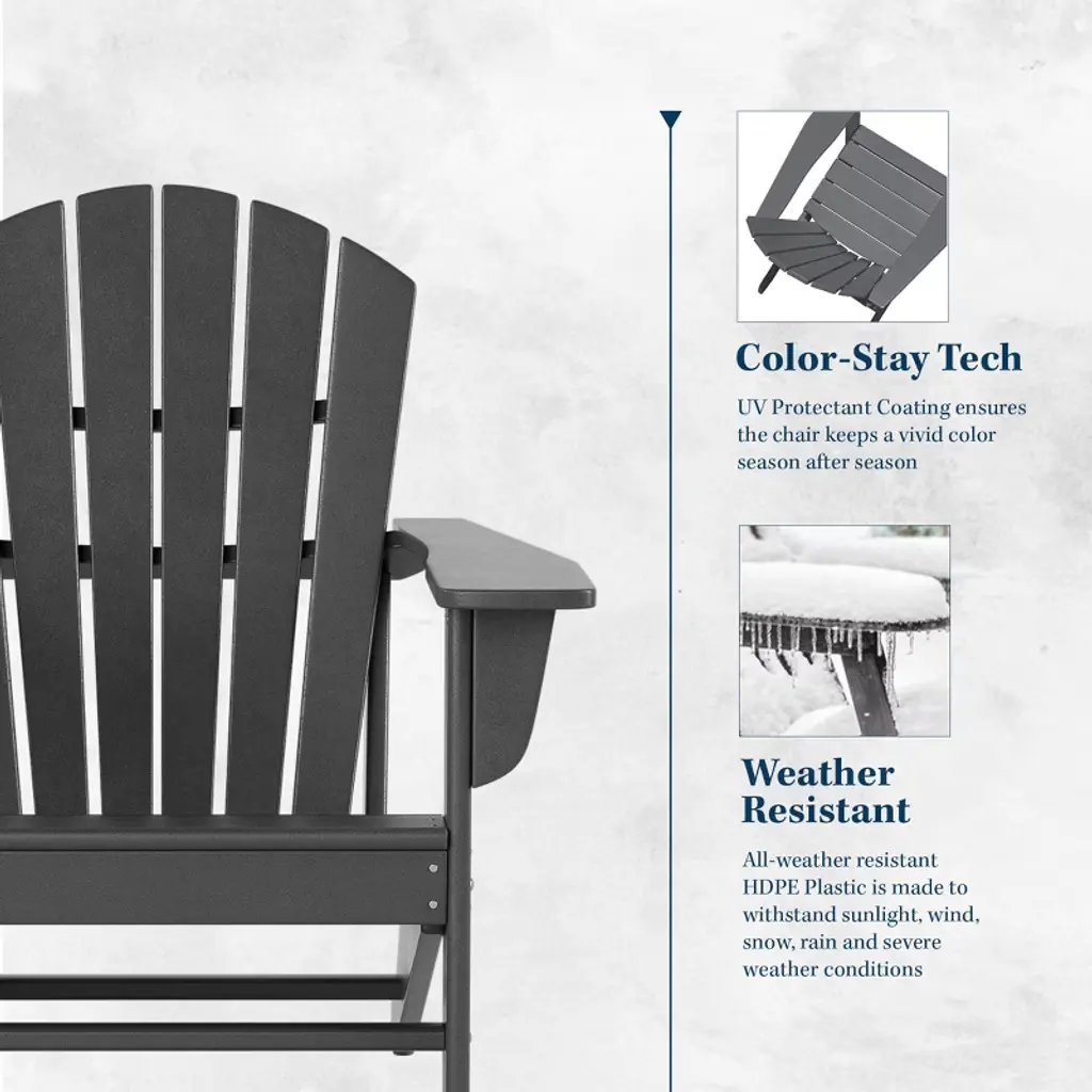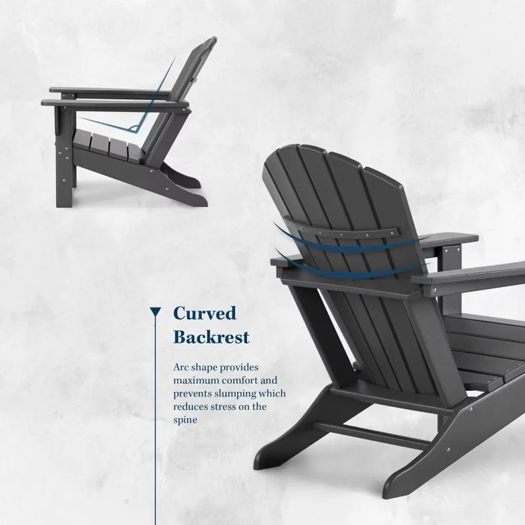Sit back, relax, and catch a tan or enjoy some family time on these stunningly crafted 5-piece Adirondack chairs with ottoman set. Designed with comfort and style in mind, with a broad armrest for extra armroom, a seashell design and curved reclined backrest for a more comfortable seat, and a high back that helps create less tension on your back. Constructed from a durable and solid HDPE material that is weather resistant and, unlike wood, won't rot, crack, chip, peel, or splinter. A UV-protective coating prevents fading, keeping the colors vibrant and amazing all year long. These attractive chairs are easy to clean, making them perfect for the outdoors, and they are sure to make your backyard the place to be.While we strive to accurately represent product colors, please be aware that actual colors may vary slightly due to individual screen settings and lighting conditions. FeaturesSet includes two (2) Adirondack chairs with two (2) ottomans and one (1) side tablestain-resistant in case of any accidentsWeather-resistant material safeguards against the elements and UV ray coating stops color fadingSturdy construction that is long-lasting and resistant to chipping, flaking, or splintersSimple to clean with just soap, water, and a soft brushVariety of lovely fade-resistant colorsMade of weather-resistant material that can survive the outdoor elementsDetails:Product Type: Patio Conversation SetsWhat's Included: (2) Adirondack Chair; (2) Ottoman; (1) Side TableAdirondack ChairDimensions: 31.75" W x 33.5" D x 36.5" HWeight: 42 lbs.Seat Width: 22"Seat Depth: 20"Seat Height: 15"Weight Capacity: 450 lbs.OttomanDimensions: 20" W x 13.5" D x 18.75" HWeight: 8.75 lbs.Seat Width: 22"Seat Depth: 20"Side TableDimensions: 17.5" W x 17.5" D x 18" HWeight: 10.5 lbs.Weight Capacity: 180 lbs.